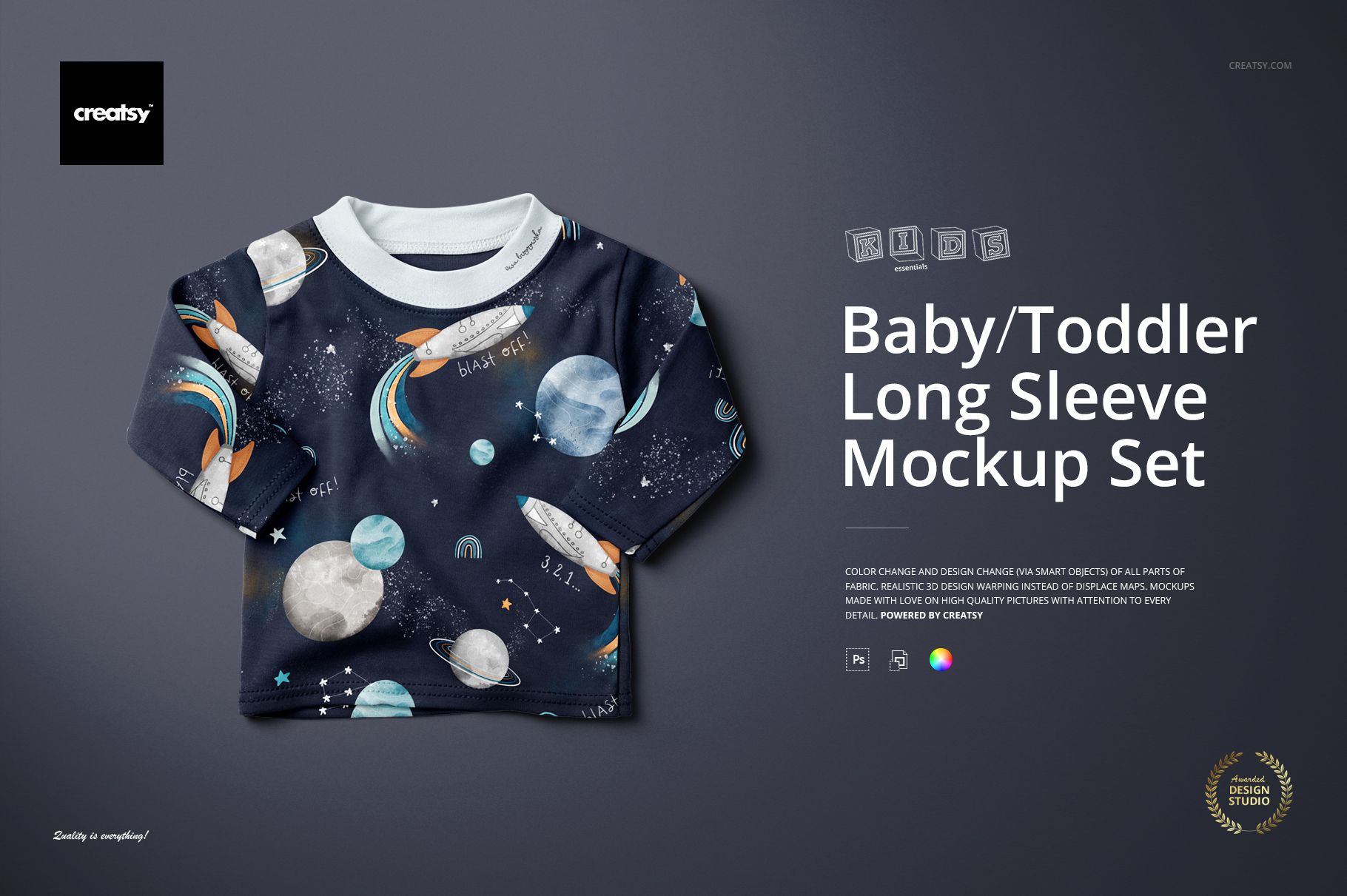 Baby and Toddler Long-Sleeve Sweatshirt Mockup Set template by Creatsy provides high-quality pictures perfectly warped into stunning PSD baby clothing mockup scene files you can mock up with your design. The well-organized, customizable Adobe Photoshop layers of the mockup set enable you to showcase your design realistically. This baby sweatshirt mockup template set gives you both the front of the infant sweatshirt and back of the jogging suit top. The toddler practice jersey mockup features a cover-stitched, ribbed crewneck collar, cuffs, and hem with serged sleeves and side seams. The lightweight infant’s sweatsuit top can be used as long-sleeve pajamas with sweatpants or over a blouse with jeans. It is guaranteed to keep babies at the right temperature while dressing for comfort and style, making it the perfect piece of apparel for every infant. A versatile garment, little ones are sure to be ready for any occasion while showing off your custom illustration and pattern designs on these baby mockups. Your motifs and patterns take center stage on the cotton fabric of actual kids’ clothes in this toddler clothing tracksuit mockup. With easy-to-edit smart objects and color layers, elements can be relocated, fully customized, or removed—completely personalized to fit your needs. Excellent for artists, surface pattern designers, and hobbyists alike, these kids’ apparel mockups will enhance your brand, professionally elevating the portfolio of every creator.