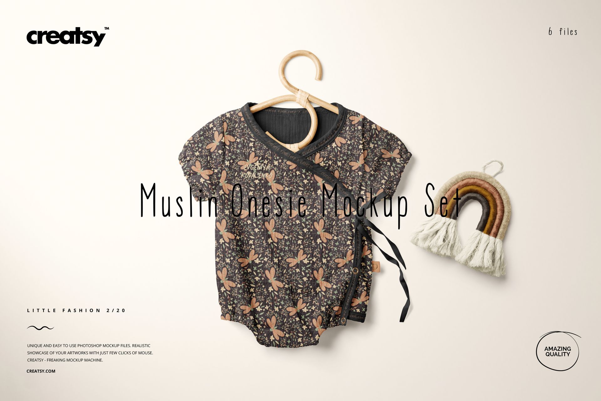 The Muslin Onesie Mockup Set (20/LFv.2) is a unique tool that transforms high-quality images into breathtaking Adobe Photoshop product mockup scenes that effortlessly complement your artwork, logos, and designs. Brace yourself as the Muslin Onesie Mockup Set (20/LFv.2) lets your design take center stage, captivating viewers with its realism, charm, and sheer visual brilliance. Dive into a world of endless possibilities as you unleash your creativity through painstakingly organized Adobe Photoshop layers, offering unprecedented customization options. Seamlessly edit smart objects and color layers, effortlessly shaping and refining your composition to reflect your unique vision. Whether you're an artist, surface pattern designer, or an aspiring creator, our mockups further your brand and infuse your portfolio with professional allure.