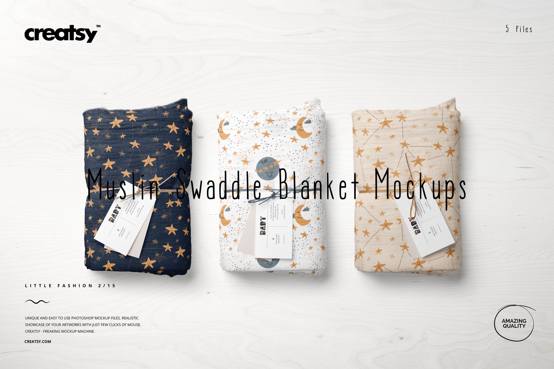 Creatsy embodies a spirit of unparalleled excellence, consistently delivering mockup files of the utmost quality to illuminate and showcase your extraordinary artwork in an awe-inspiring realistic setting. Our unwavering commitment to perfection drives us to provide the tools to propel you toward realizing your business aspirations and expanding your cherished customer base. Meticulously organized mockup files stand as the lifeblood of every visionary designer, artist, or illustrator yearning to present their prized creations in a manner that commands attention and captivates potential customers. The remarkable Muslin Swaddle Blanket Mockup Set (15/LFv.2) emerges as the epitome of mockup brilliance, effortlessly expanding your audience, enriching your portfolio, and attracting new patrons en masse with its innate ability to infuse your designs with an irresistible allure. Step into the limelight, embrace Creatsy's awesome mockups, and let your artistic vision captivate the hearts and minds of all who behold it.