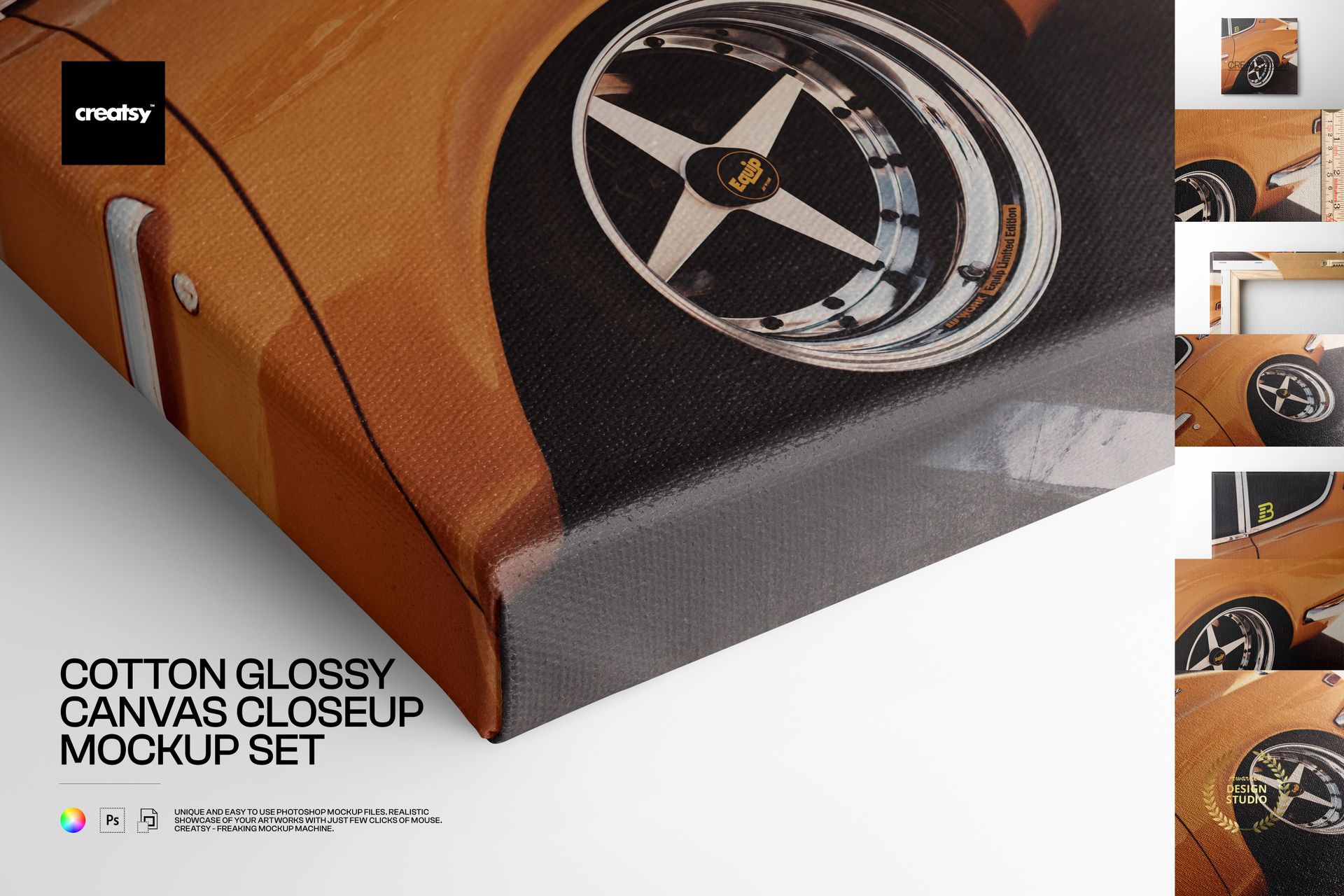 Gallery wrap canvas mockup with a detailed view of an orange car, highlighting texture and print quality.