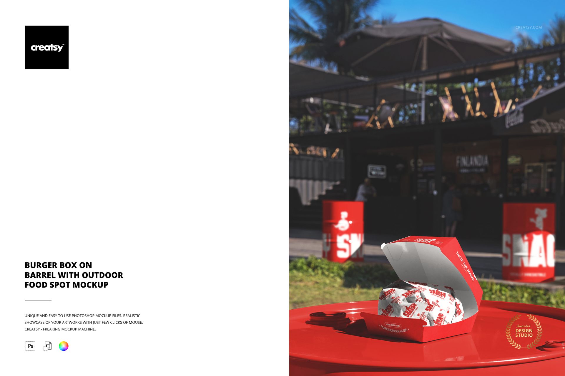 Burger Box on Barrel with Outdoor Food Spot Mockup