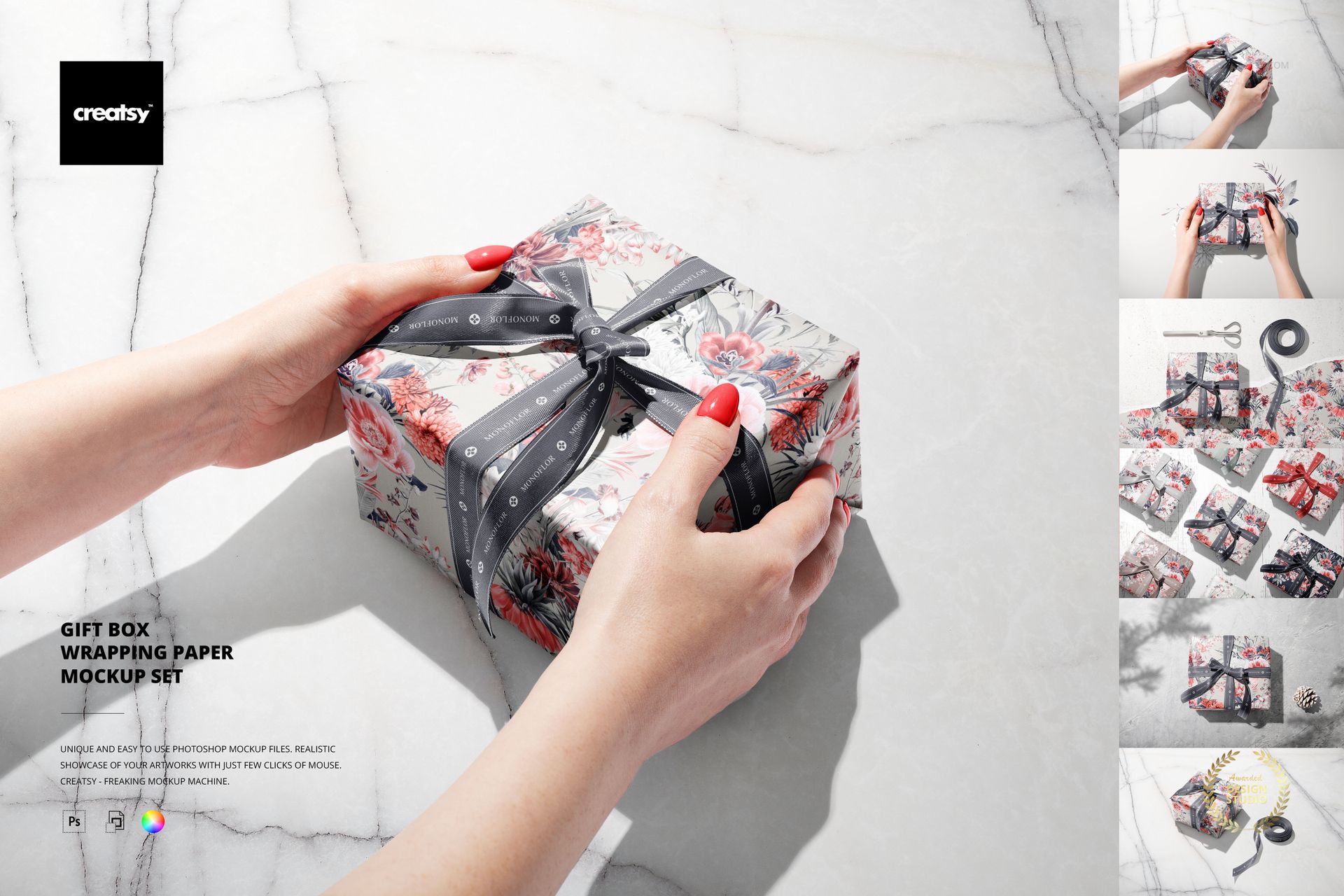 Gift Box Wrapping Paper Mockup Set is a set of layered, editable Adobe Photoshop files prepared from high-quality photographs to showcase your custom design. By editing smart objects and color layers, you can customize how your designs look. With the help of mockup files, you can showcase your design and present it professionally. Gaining a competitive edge over your market rivals is easy with Gift Box Wrapping Paper Mockup Set in your portfolio.