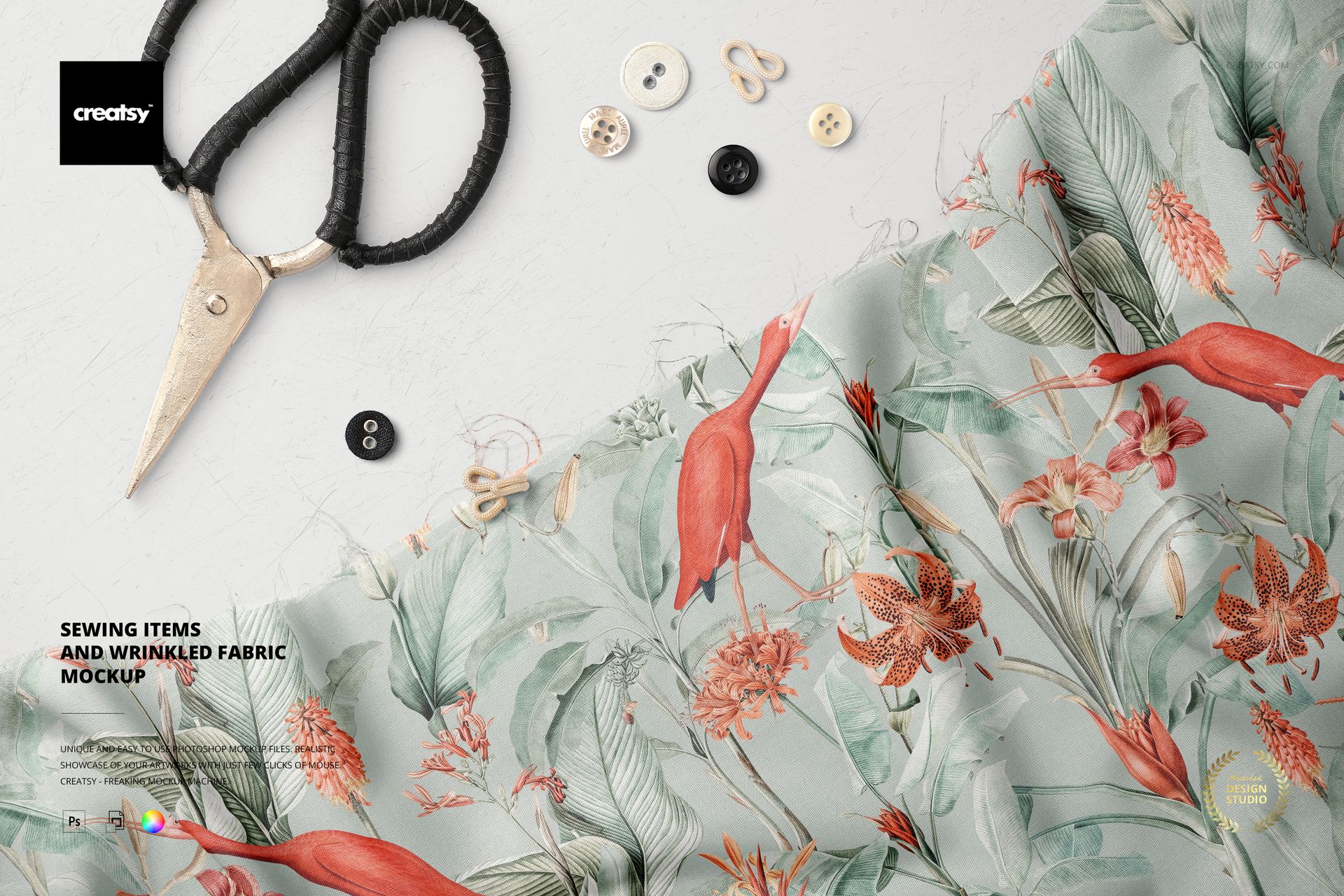 Sewing Items and Wrinkled Fabric Mockup template by Creatsy provides various fabric angles to which you can apply a custom design or color. This fabric mockup is an attractive way to show off your creations. Color layers and smart objects are competently arranged in this textile mockup, giving you total control over how you customize the background and fabric using solid colors, gradients, and custom designs. A versatile mockup for any situation, the Sewing Items and Wrinkled Fabric Mockup is a sensible way to share the functionality of your artwork. Every Adobe Photoshop mockup file contains well-organized layers with easy-to-use features, allowing you to customize the fabric mockup to your satisfaction. Color layers and smart objects make your designs pop in the background. Adding textures, hiding objects, concealing drop-shadows, and saving the files with transparency make this textile mockup a handy way to show off your designs!