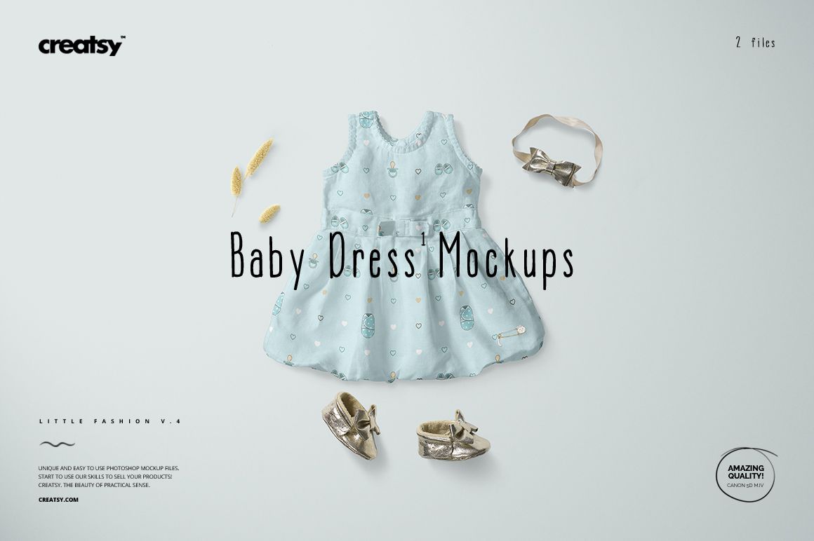 Baby Dress Mockup Set (04LFv.1) is a mockup set with layered, editable Adobe Photoshop files prepared from high-resolution images. Color layers and smart objects allow you to showcase your custom design with maximum editability. With the help of mockup files, presenting your designs professionally will give you an edge over your competitors.