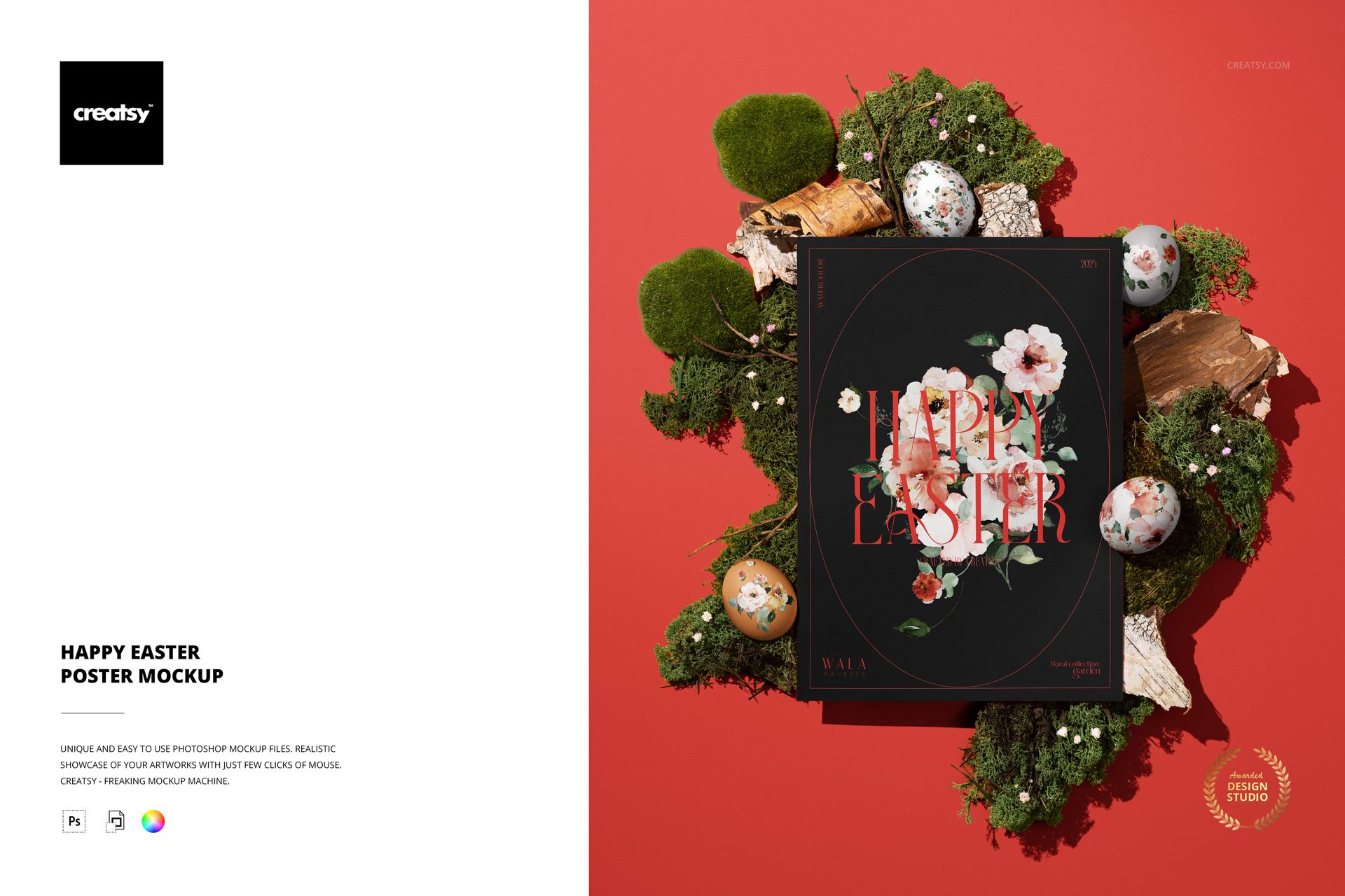 Showcase Easter-themed poster designs, greeting art, or seasonal branding in a lush spring arrangement with this Free Happy Easter Poster Mockup. Drop your artwork into Smart Objects to instantly wrap it around the poster and decorative eggs, complete with realistic shadows, texture, and lighting. Free for commercial use – see license for details.