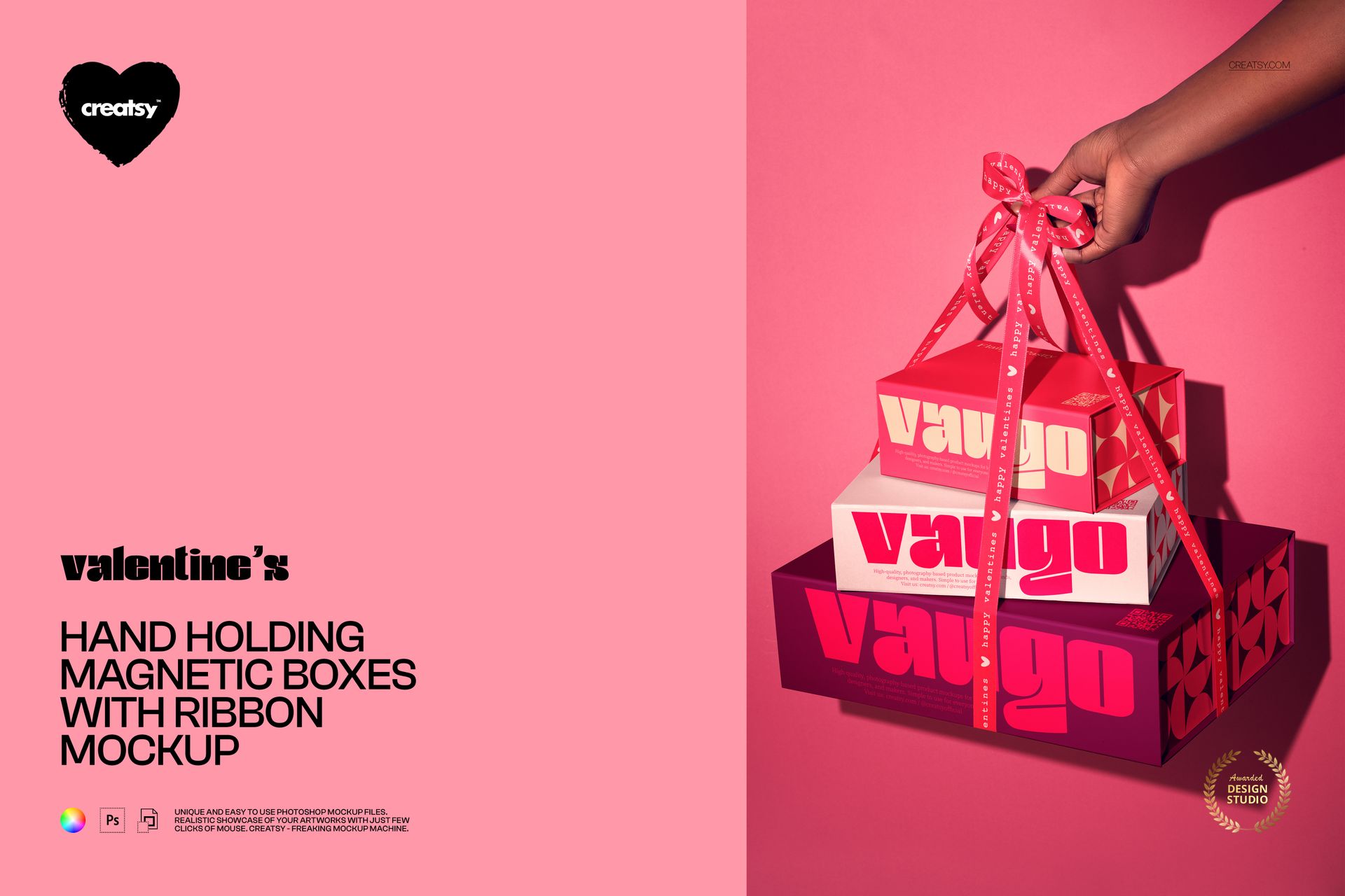 Hand Holding Magnetic Boxes with Ribbon Mockup