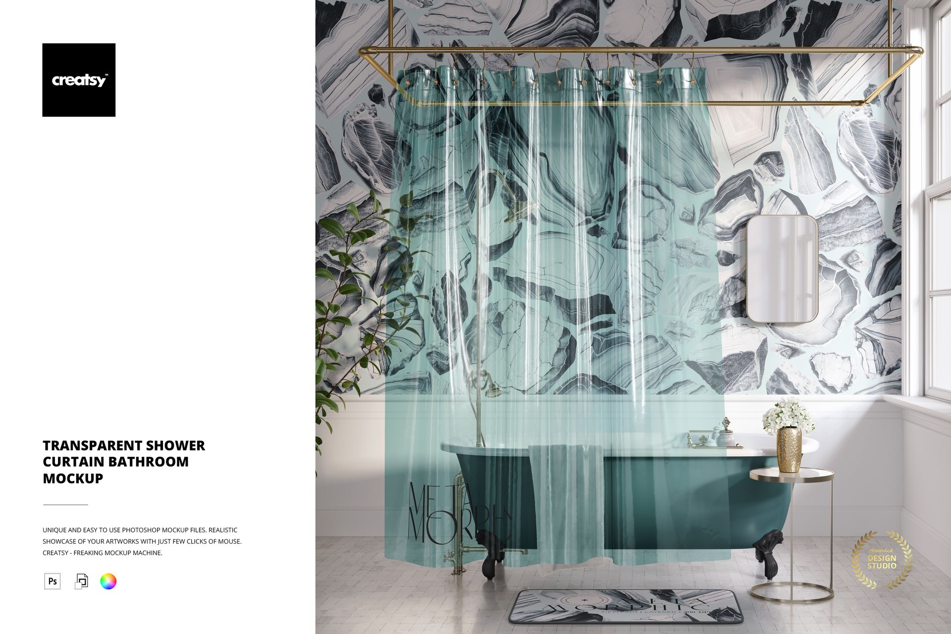 With this mockup, the possibilities are endless. You have the power to customize and personalize every element to match your vision! Change the color and design of the bathroom wall and floor tiles to achieve the perfect aesthetic. Tailor the bath mat and towel to your liking to ensure they harmonize with your chosen style. Experiment with the color of the shower curtain, the finish of the bathtub, the mirror frame, the window frame, the table, and even the vase on the table.