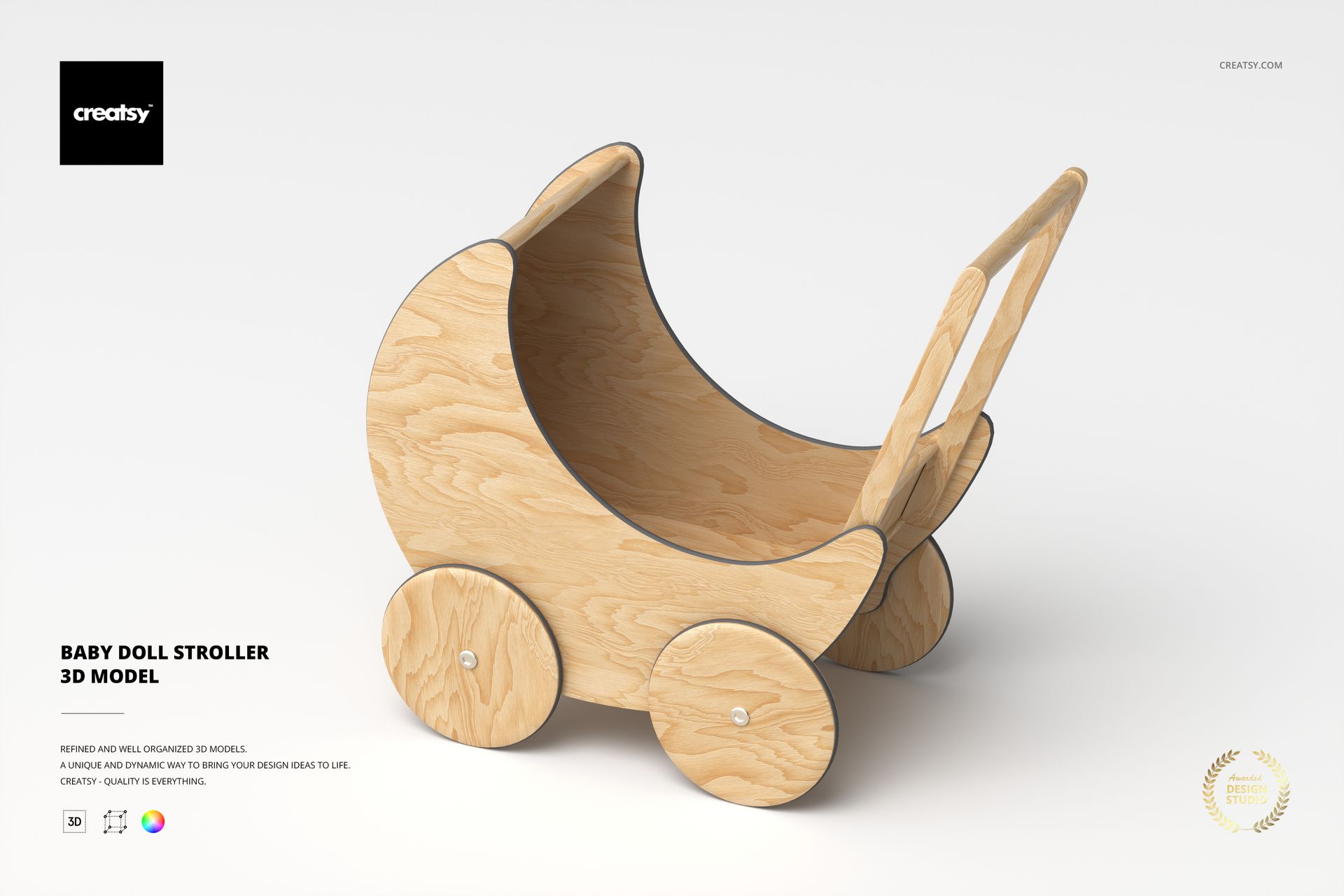 Wooden baby doll stroller 3D model with curved sides and four wheels, shown in a front angled view on a light background.