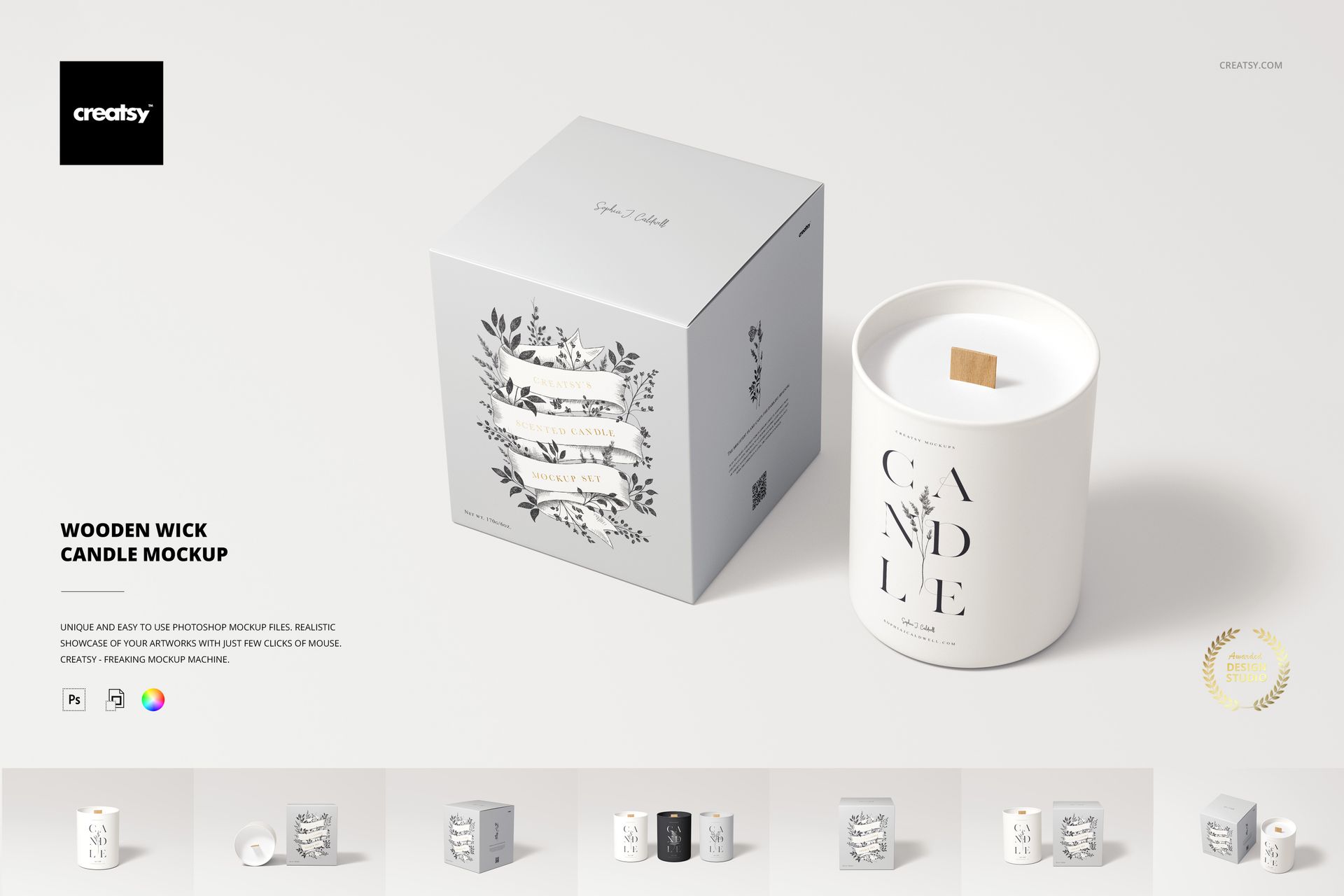 Introducing the exquisite and versatile Wooden Wick Candle Mockup from Creatsy. Crafted to perfection, this mockup set allows you to showcase your custom candles and custom candle boxes in an incredibly realistic way, making it an essential tool for designers, entrepreneurs, and candle enthusiasts alike. Elevate your brand presence and captivate potential customers with stunning visuals that highlight the unique features of your custom scented candles.