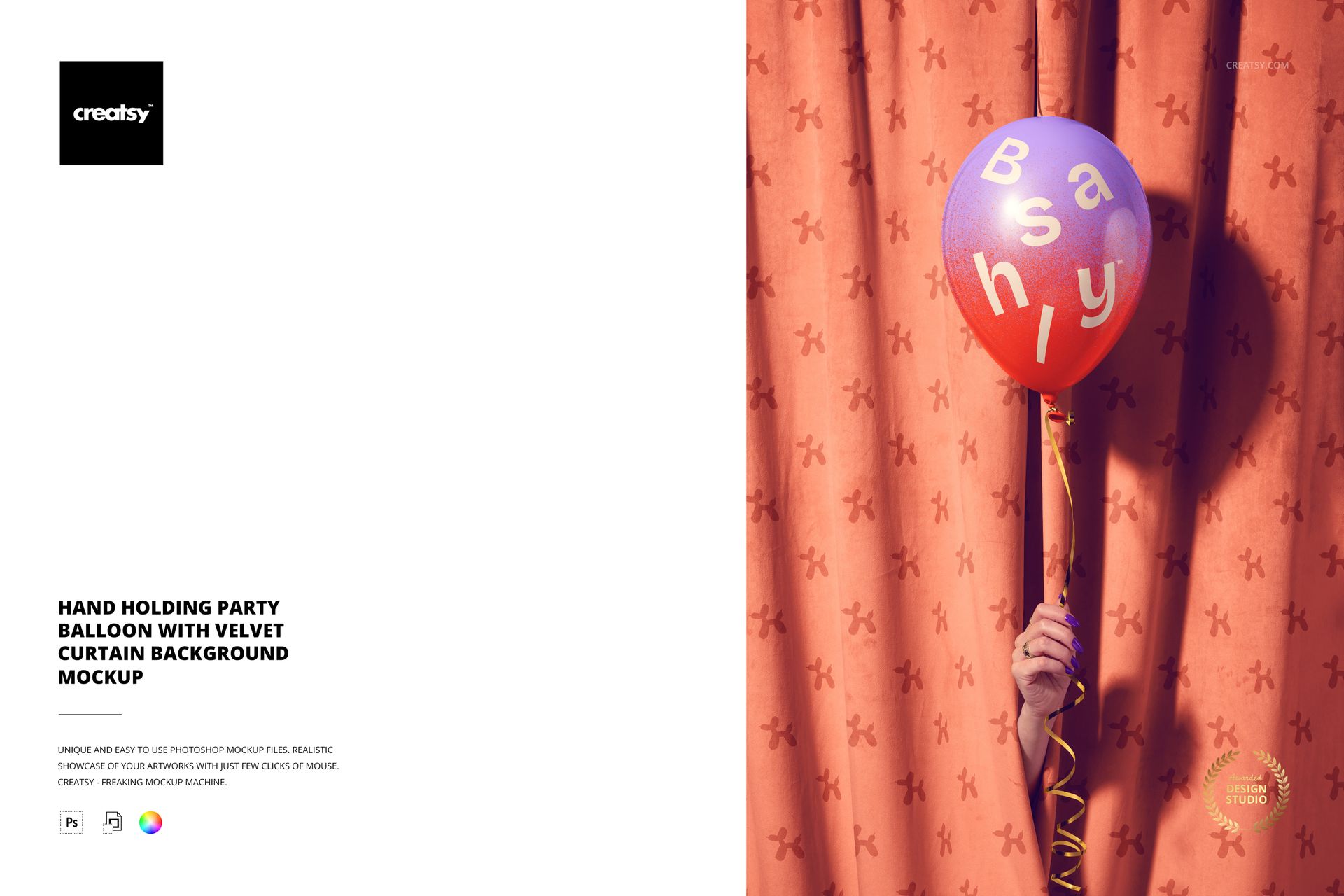 Hand Holding Party Balloon with Velvet Curtain Background Mockup