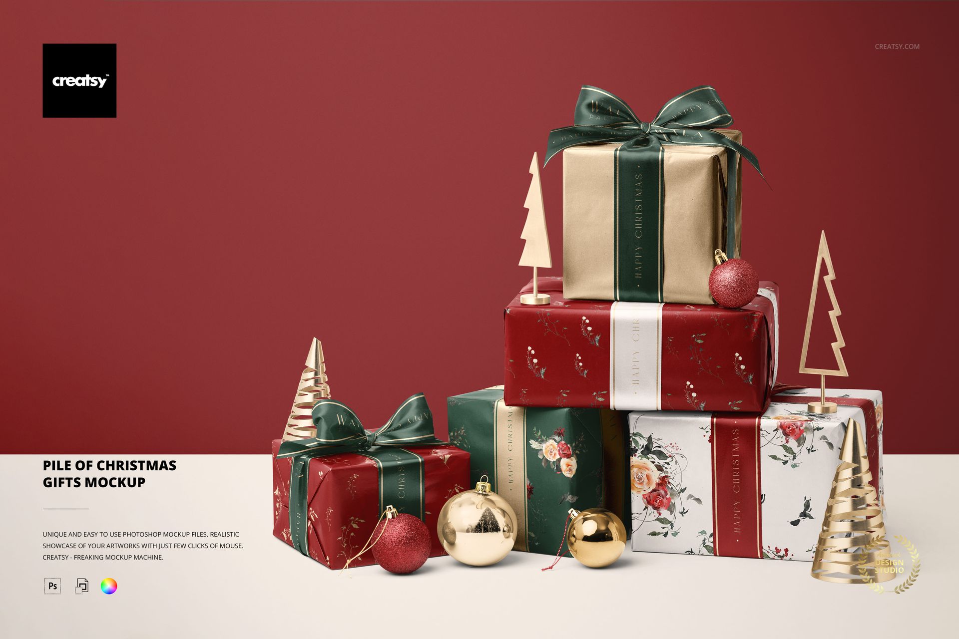 Uncover the magic under the Christmas tree and witness the enchantment Santa has left just for you! Immerse yourself in the nostalgia of childhood dreams with our Pile of Christmas Gifts Mockup, featuring a generous pile of 5 large gifts, each wrapped in unique Christmas paper and tied with a perfectly crafted ribbon bow. Surrounding this festive pile is an array of holiday decorations - miniature trees, glittering baubles and shiny ornaments - creating a scene that beckons you to design and shine!