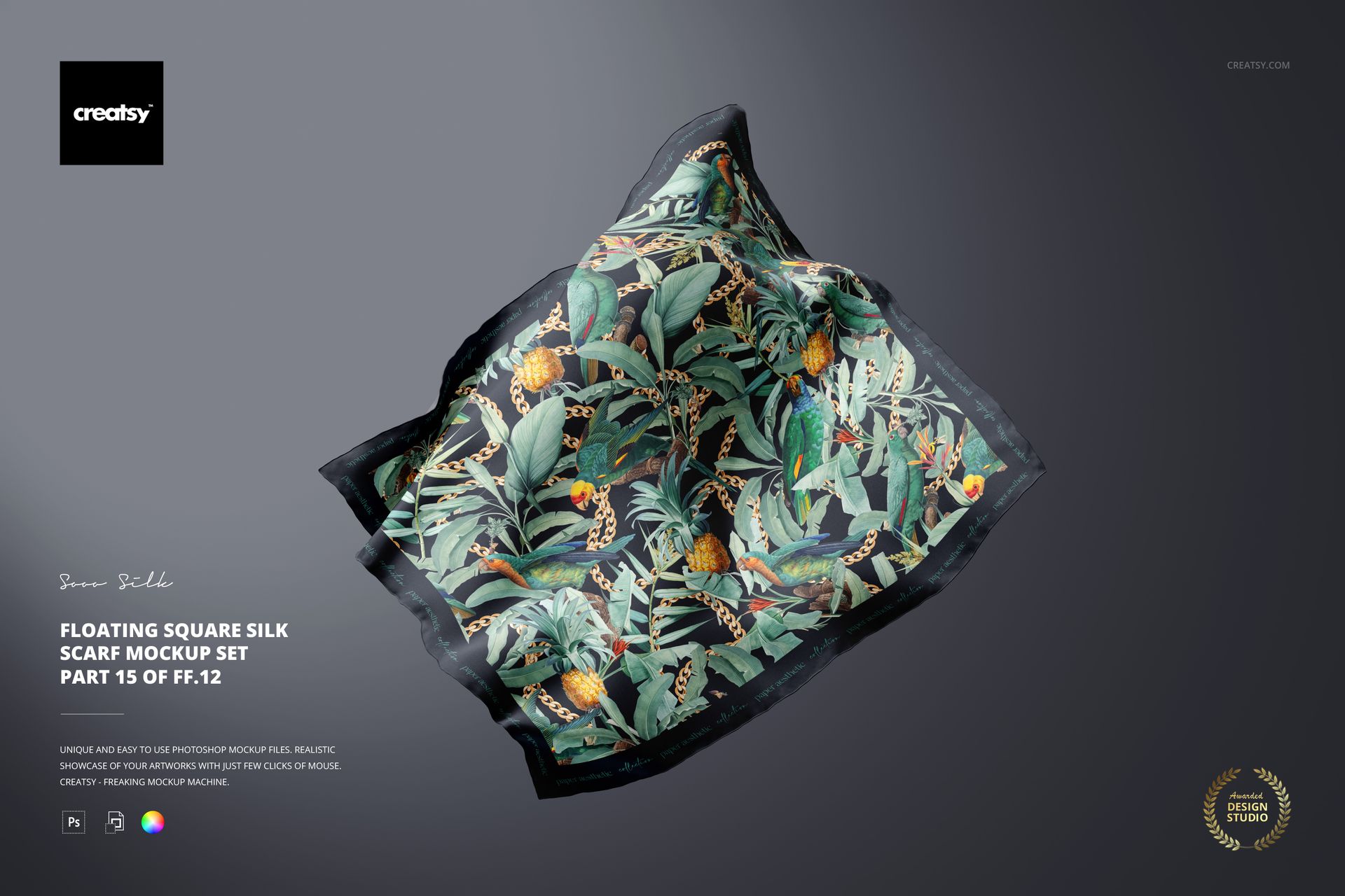 Floating Square Silk Scarf Mockup (15FFv.12) is a mockup file with editable Adobe Photoshop layers that uses smart objects, color layers, and shadows to portray your designs on actual products. Showcasing your design has never been easier, giving you a competitive advantage in the marketplace.