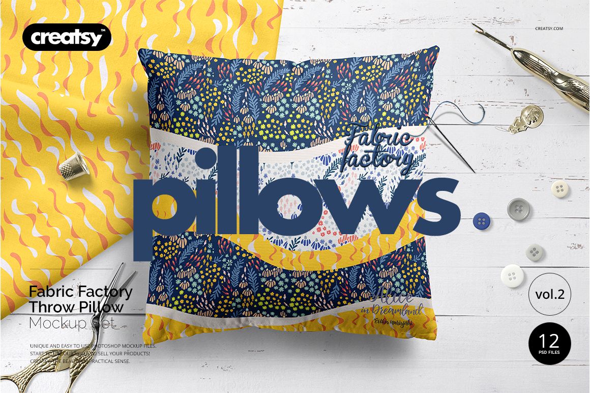 Creatsy provides first-rate mockup files. Displaying your artwork in a realistic setting can expand your current customer base and your profit. Well-organized mockup files are a must-have for every designer, artist, or illustrator to present their artwork and products in an attention-grabbing way. Fabric Factory vol.2: Throw Pillow Mockup Set is a perfect mockup for your designs. Build your portfolio and improve your online presence using only the best—Creatsy mockups.