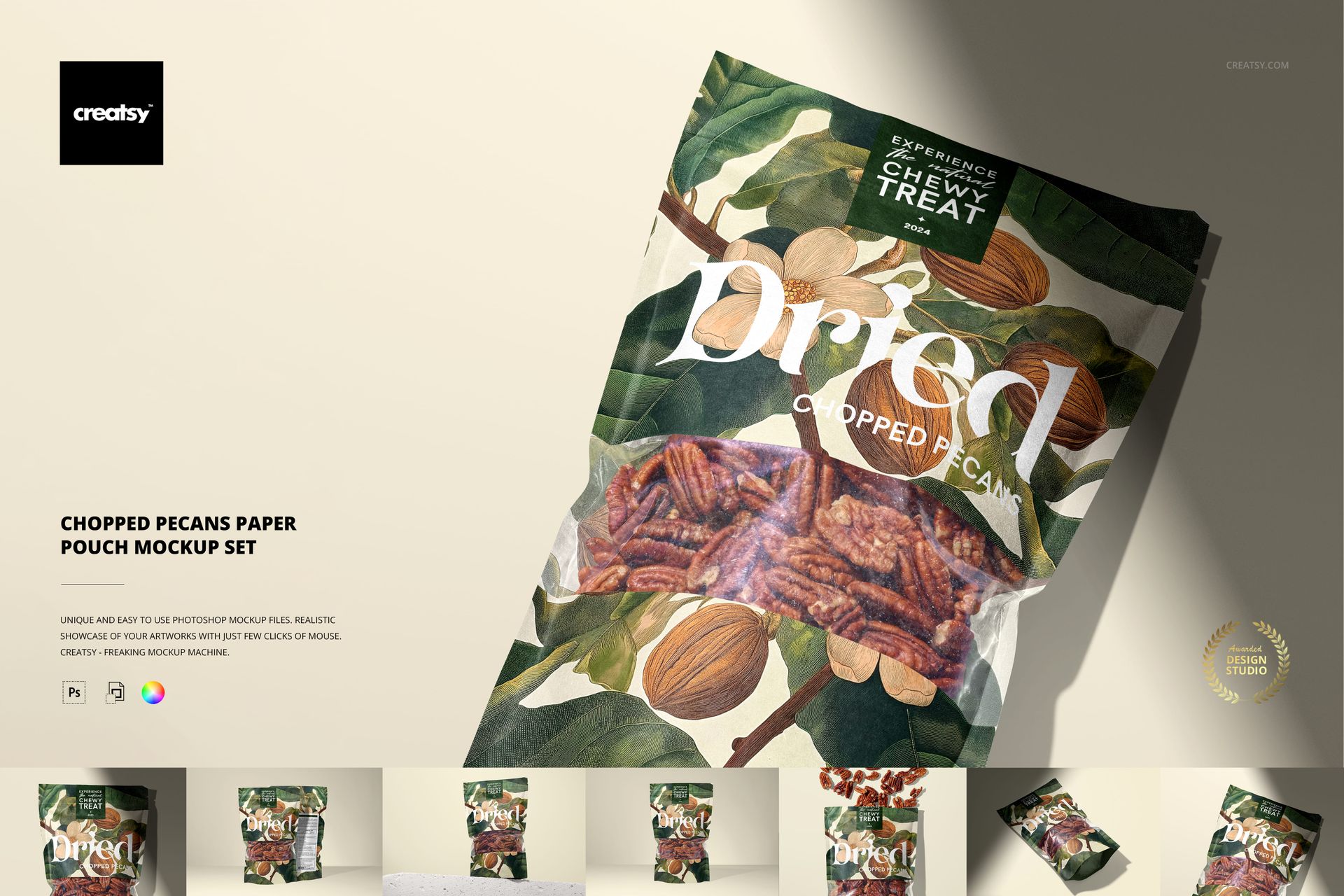Add some crunch to your packaging portfolio with the Chopped Pecans Paper Pouch Mockup Set – a bold and versatile mockup collection crafted for healthy food producers, restaurant owners, and creative professionals who want to showcase their branding in style. This set brings your designs to life with rich texture, authentic lighting, and plenty of visual flavor.