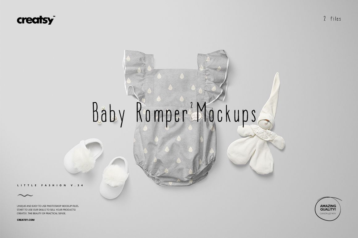Baby Romper 2 Mockup Set (34/LFv.1) is a mockup set with layered, editable Adobe Photoshop files prepared from high-resolution images. Color layers and smart objects allow you to showcase your custom design with maximum editability. With the help of mockup files, presenting your designs professionally will give you an edge over your competitors.