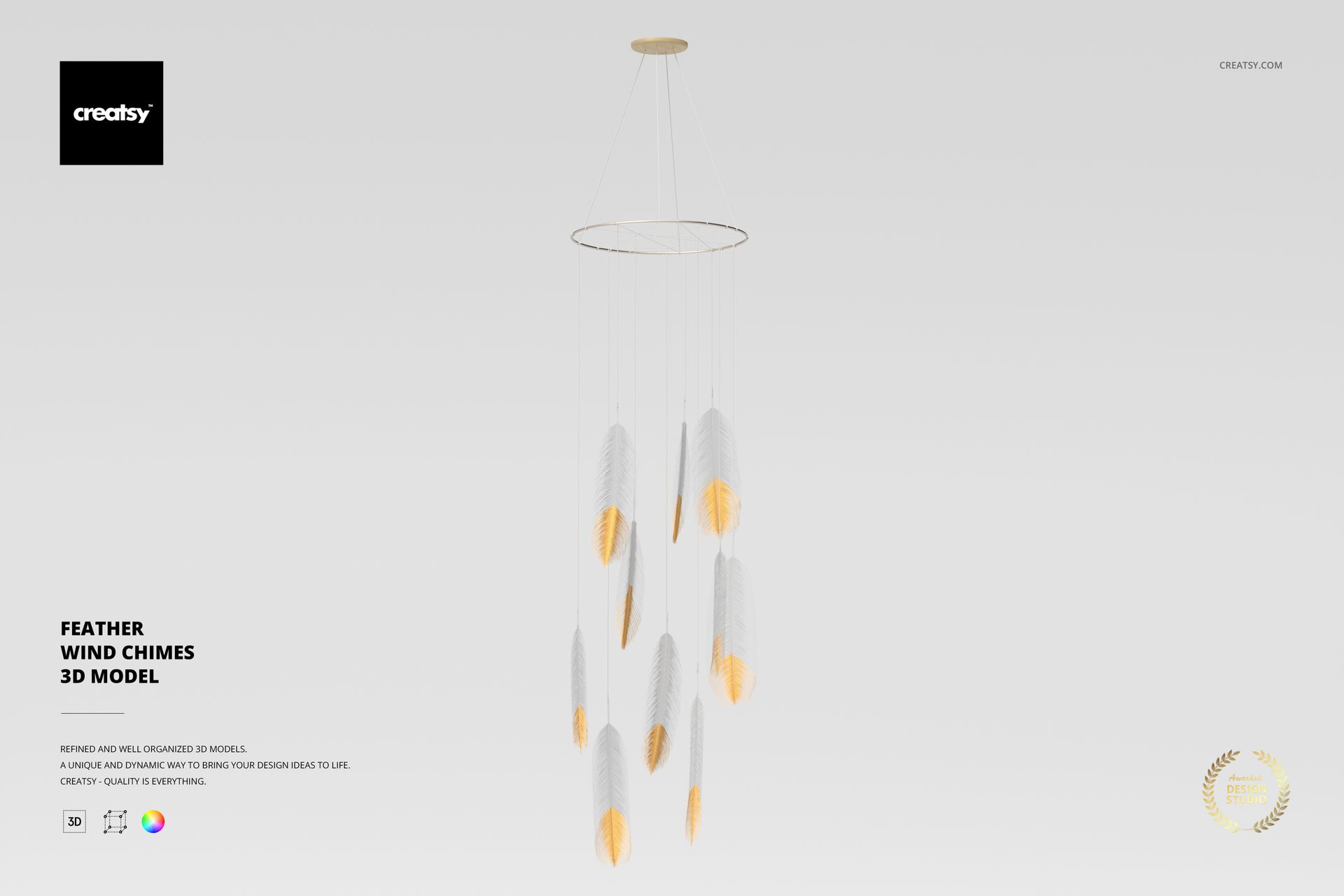 Front view of a 3D model wind chime with multiple feather-shaped elements hanging from thin strings on a circular frame.