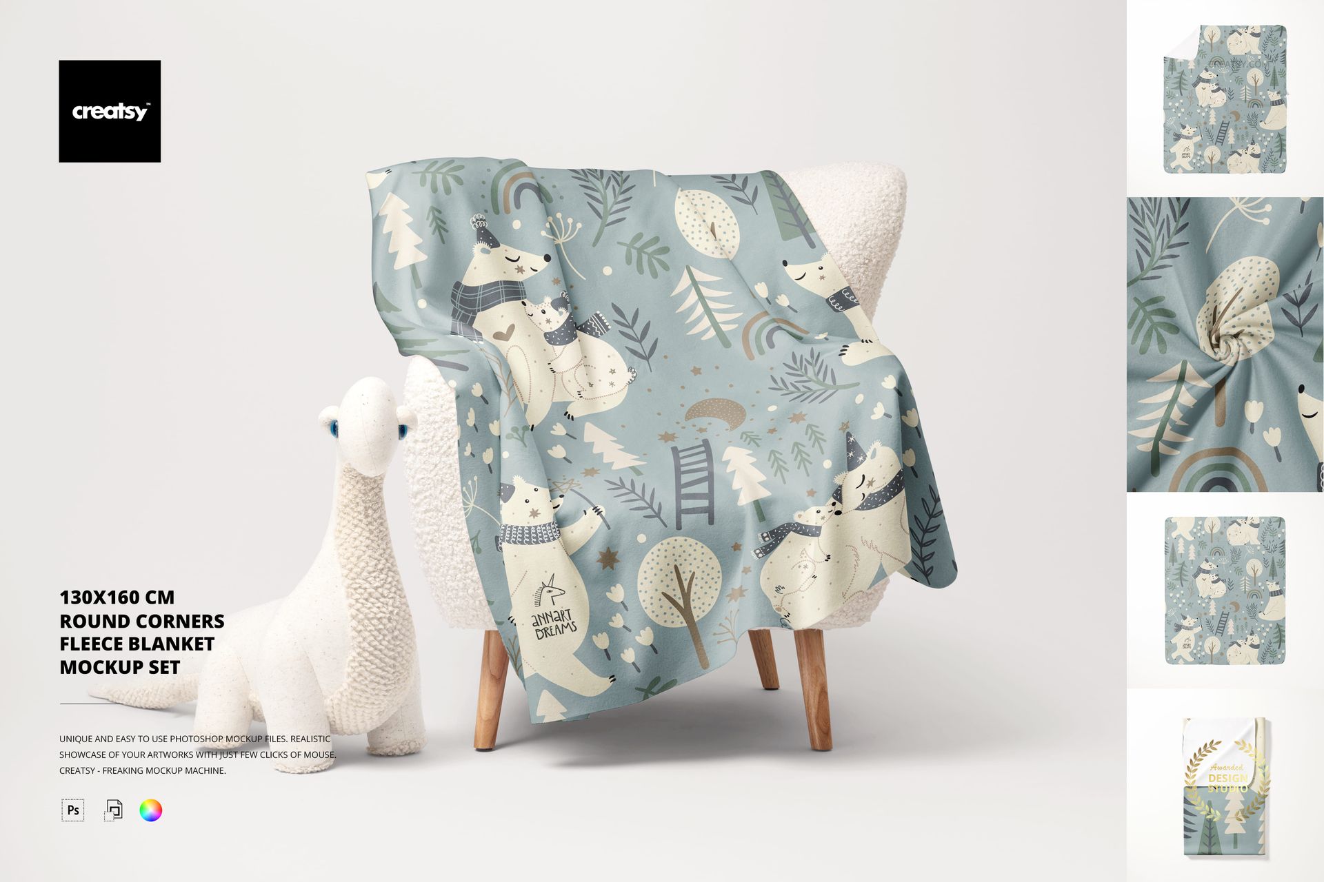 Inside the set, you’ll find five thoughtfully styled PSD files. The blanket is shown draped over a cozy sherpa chair next to an adorable plush toy, spread flat for a clear top-down view, neatly folded for packaging display, twisted in a swirl for dynamic texture, and presented with a single corner turned up to spotlight print precision. These varied compositions allow you to reveal every aspect of your textile design while evoking warmth and familiarity.