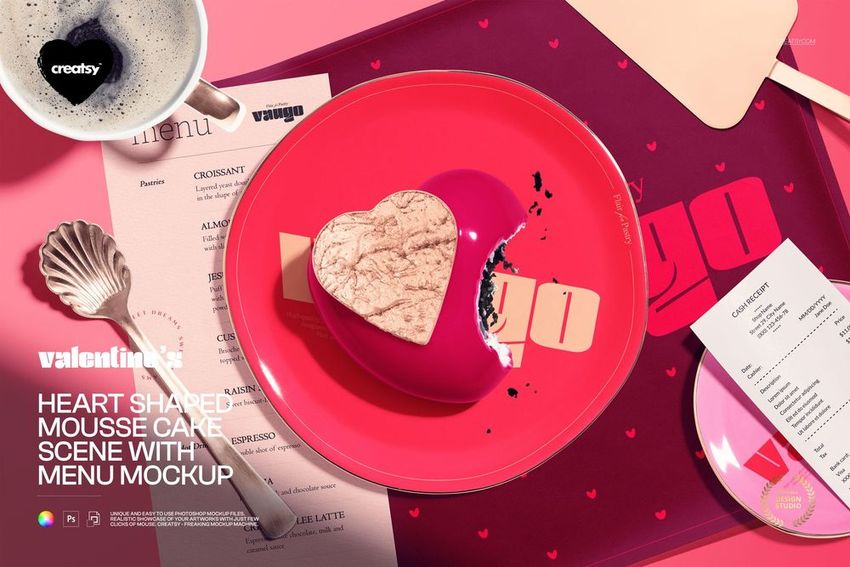 Heart Shaped Mousse Cake Scene with Menu Mockup