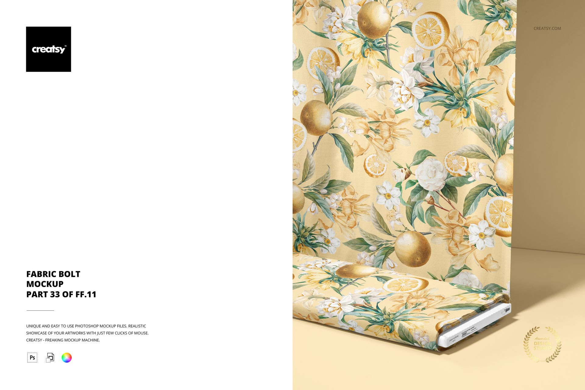 Discover the extraordinary Fabric Bolt Mockup (33/FFv.11) by Creatsy-a revolutionary product mockup that defies boundaries and propels your designs to unparalleled heights. Meticulously crafted with attention to detail, the Fabric Bolt Mockup (33/FFv.11) seamlessly presents your artwork mesmerizing and captivatingly. Each layer has been thoughtfully organized in Adobe Photoshop, ensuring effortless navigation and optimal display of your designs. Integrating your artwork with the product is flawlessly executed, preserving its vibrancy and color saturation. Experience the enchantment as expertly crafted overlay layers of shadows and highlights seamlessly blend your creations into the mockup scene, forging a truly immersive visual experience.