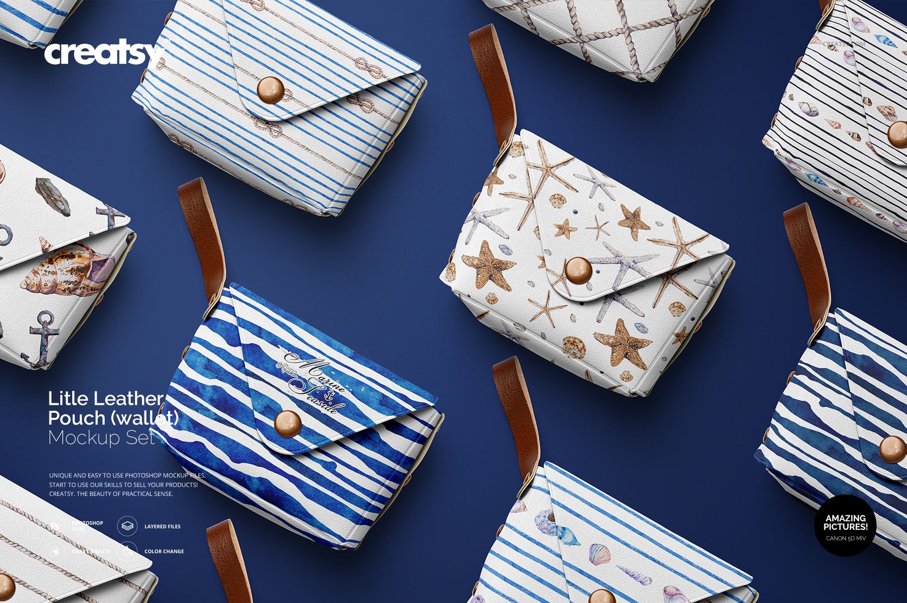 Little Leather Pouch Wallet Mockup Set is a mockup set with editable Adobe Photoshop layers that uses smart objects, color layers, and shadows to portray your designs on actual products. Showcasing your design has never been easier, giving you a competitive advantage in the marketplace.