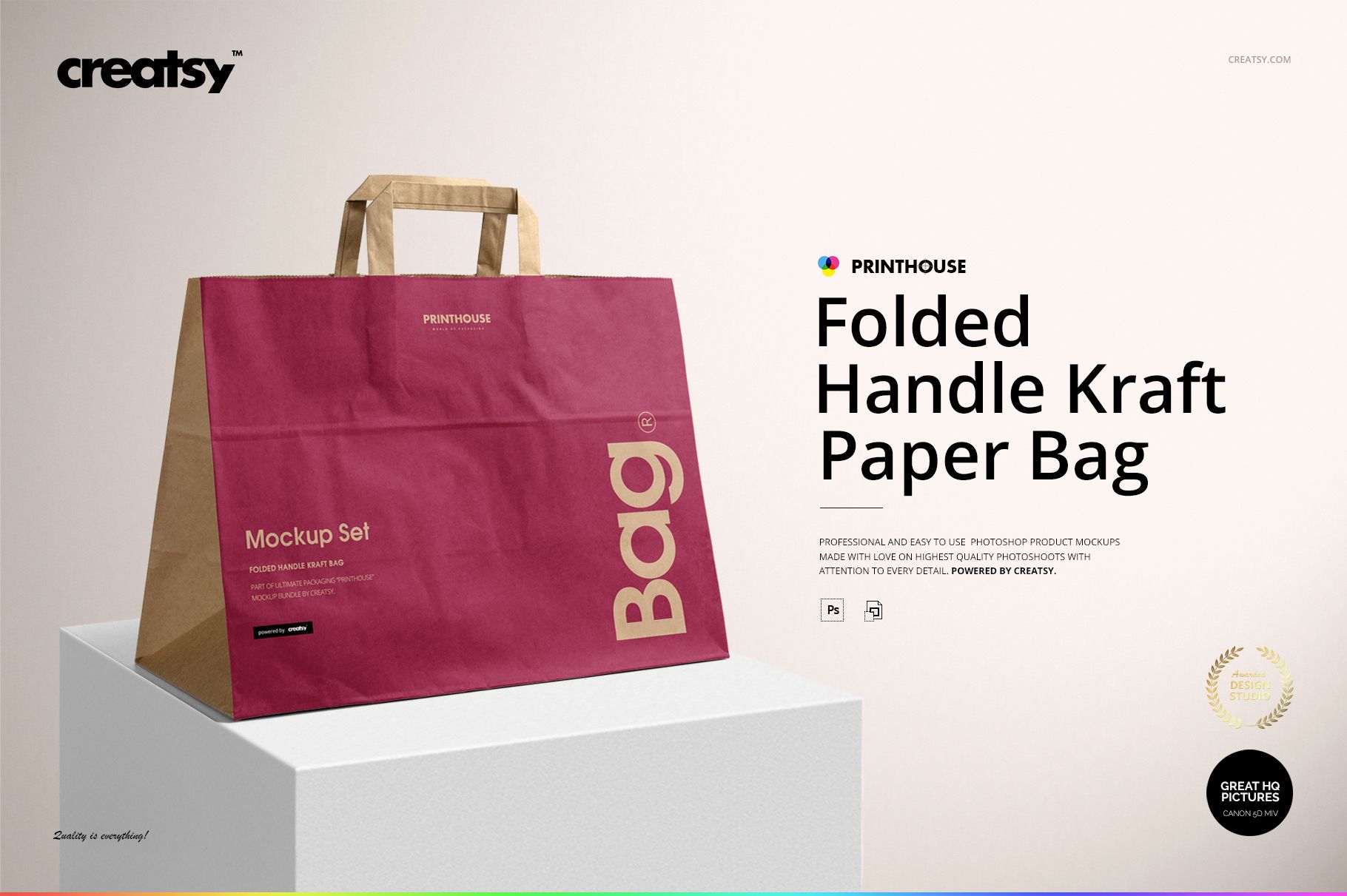 Creatsy provides superior-quality mockup files for businesses and individuals. Everyone should have access to great mockups, which is why ours are the industry standard and affordable. Well organized mockup files are a must-have for professionals of every industry who wants to present their artwork or products realistically. Showing your artwork in a realistic setting will help you achieve your business goals and expand your customer base. Reaching potential customers has never been easier with excellent-quality mockups. The Folded Handle Kraft Paper Bag Mockup Set is a fantastic way to mockup your designs for your portfolio, garner interest from your online audience and catch the attention of potential licensing agents.