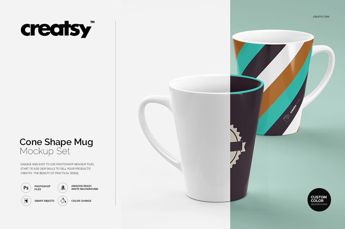 Cone Shape Mug Mockup Set template by Creatsy is a fantastic way to whet your clients' appetite using your illustrations and designs. A great way to add flavor to your illustration or design portfolio, this Cone Shape Mug Mockup Set gives you unique layouts to choose from to mock up your artwork. Each Adobe Photoshop mockup file contains well-organized layers with easy-to-use features, allowing you to personalize the mockup to your satisfaction. The color layers and smart objects enable you to tailor the mockup to your design’s specifications. This mockup set is shown in various positions and angles. You can easily change the color of the design and background. Objects and drop-shadows are on separate layers, giving you the flexibility to save the mockups with transparency. Perfect warping from every viewpoint allows your designs to integrate with the mockup seamlessly. Cone Shape Mug Mockup Set is a professional way to mock up your designs for any event.
