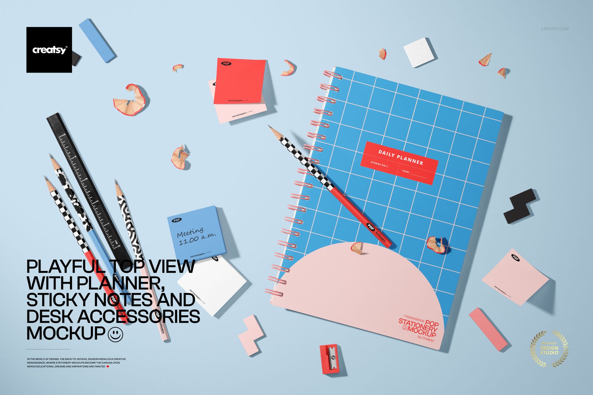 Playful Top View with Planner, Sticky Notes and Desk Accessories Mockup