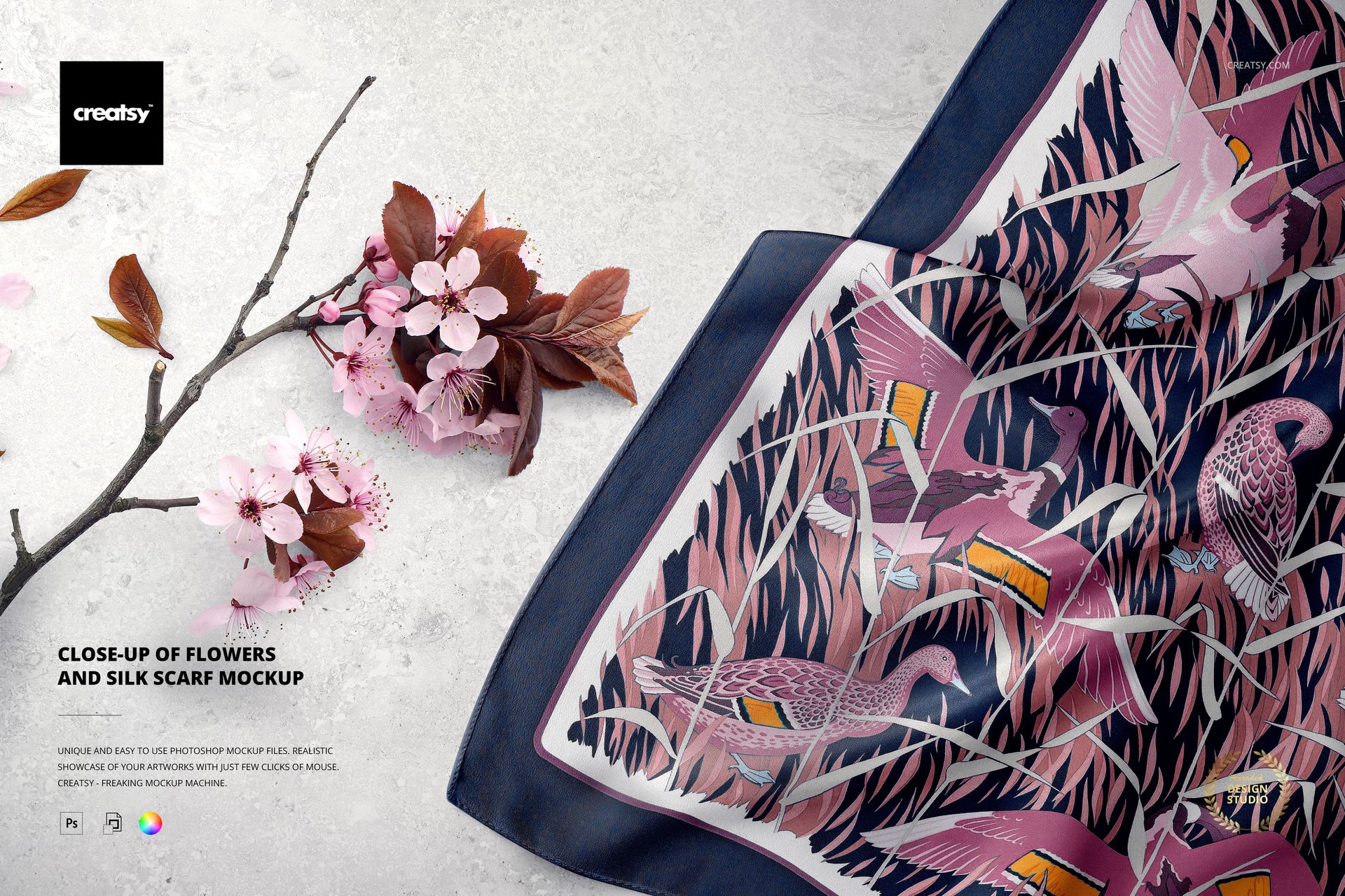 Close-up of Flowers and Silk Scarf Mockup template by Creatsy provides various fabric angles to which you can apply a custom design or color. This fabric mockup is a gorgeous way to show off your creations. Color layers and smart objects are competently arranged in this textile mockup, giving you total control over how you customize the background and fabric using solid colors, gradients, and custom designs. A versatile mockup for any situation, the Close-up of Flowers and Silk Scarf Mockup is a sensible way to share the functionality of your artwork. Every Adobe Photoshop mockup file contains well-organized layers with easy-to-use features, allowing you to customize the fabric mockup to your satisfaction. Color layers and smart objects make your designs pop in the background. Adding textures, hiding objects, concealing drop-shadows, and saving the files with transparency make this textile mockup a handy way to show off your designs!
