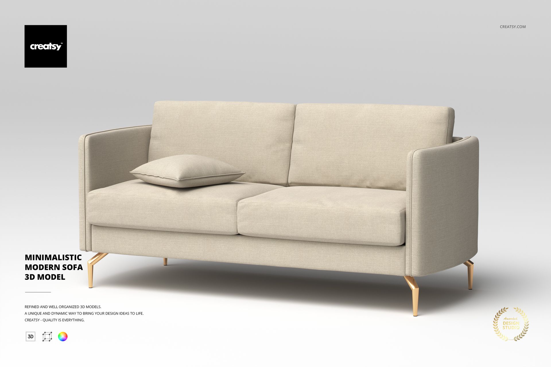 Minimalistic modern sofa 3D model in a front view, featuring a grid pattern texture and a matching cushion.