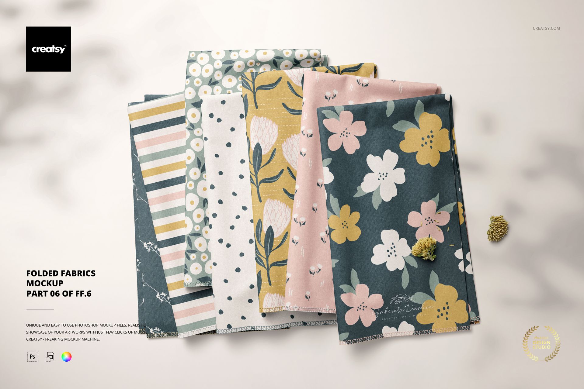 Fabric Stack Mockup (06/FFv.6) template by Creatsy provides various fabric angles to which you can apply a custom design or color. This fabric mockup is a gorgeous way to show off your creations. Color layers and smart objects are competently arranged in this textile mockup, giving you total control over how you customize the background and fabric using solid colors, gradients, and custom designs. A versatile mockup for any situation, the Fabric Stack Mockup (06/FFv.6) is a sensible way to share the functionality of your artwork. Every Adobe Photoshop mockup file contains well-organized layers with easy-to-use features, allowing you to customize the fabric mockup to your satisfaction. Color layers and smart objects make your designs pop in the background. Adding textures, hiding objects, concealing drop-shadows, and saving the files with transparency make this textile mockup a handy way to show off your designs!