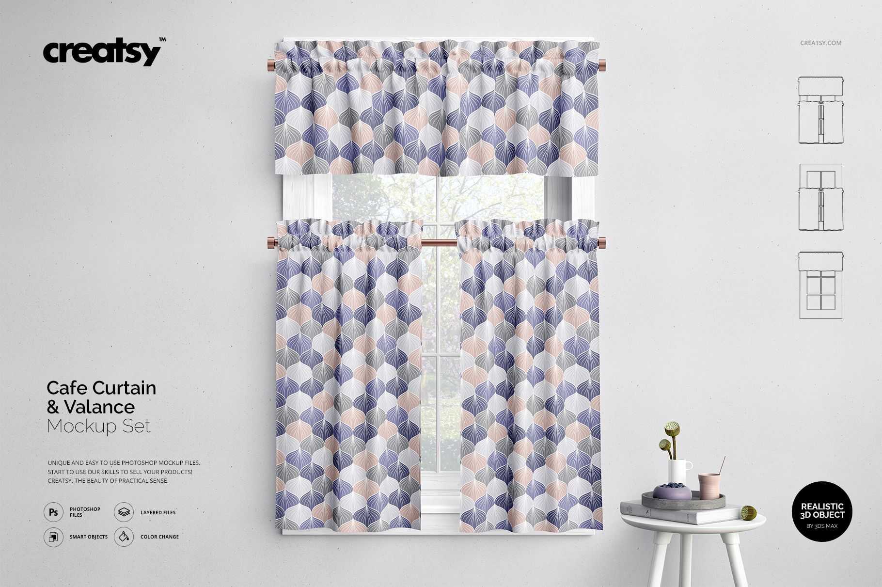 Creatsy uses only the best quality photographs to create our mockup files. Depicting your artwork on an actual product or in a scene mockup can increase your profit, expand your current customer base, and help you to reach your professional goals. Well-organized mockup files are a must-have for every designer, artist, or illustrator. Presenting your artwork and products in a realistic, eye-catching way is easy with our mockup files. This Valance and Cafe Curtains Mockup Set is a great mockup to portray your designs, build a digital portfolio, and improve your online visibility.