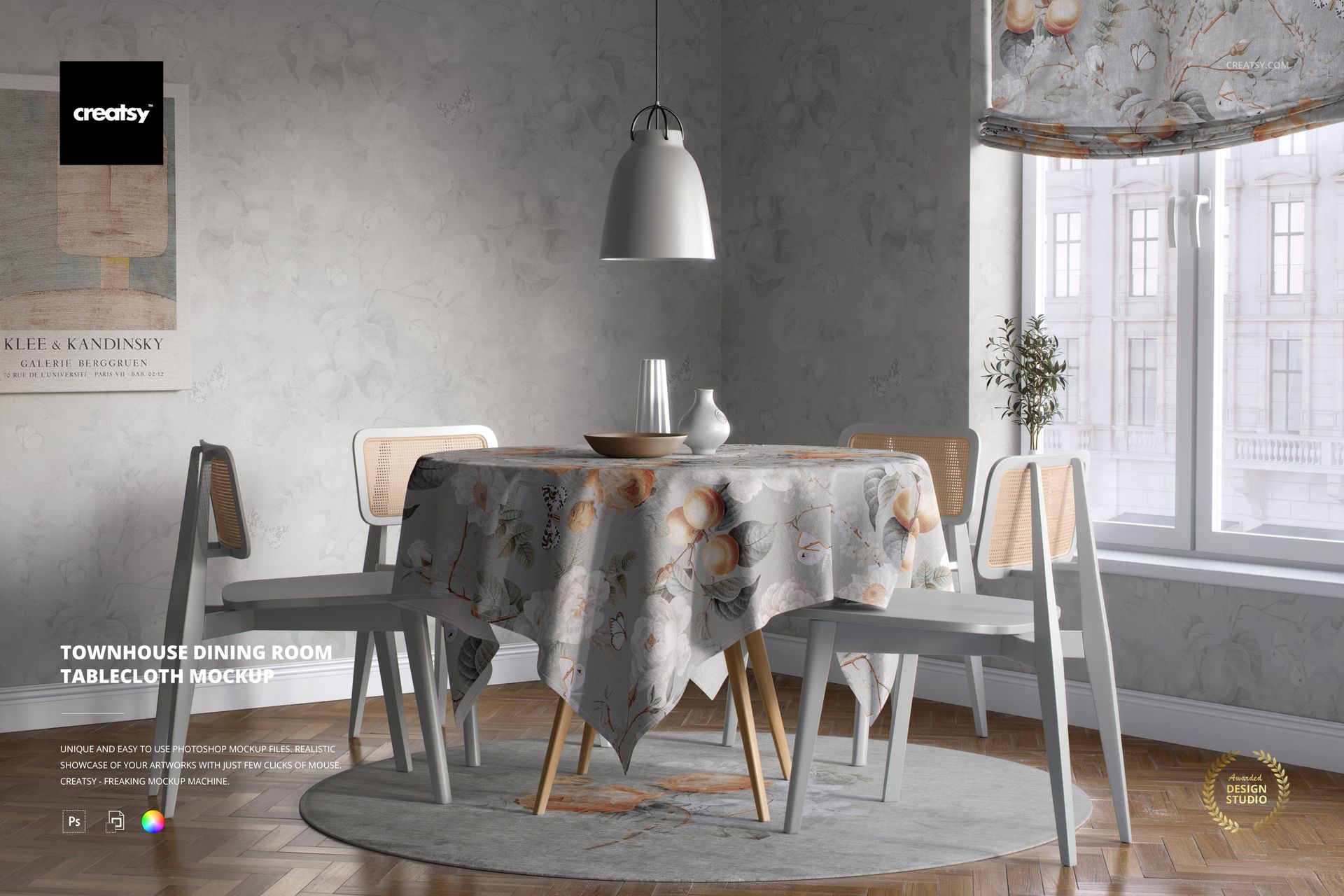 Welcome guests into a space that feels warm, artistic, and perfectly curated with the Townhouse Dining Room Tablecloth Mockup – a richly styled scene that blends cozy comfort with elegant interior design. Designed for surface pattern designers, home décor creatives, and visual storytellers, this mockup is the ideal setting to show off your textile or tableware concepts in a beautifully lit, old-town-inspired environment.
