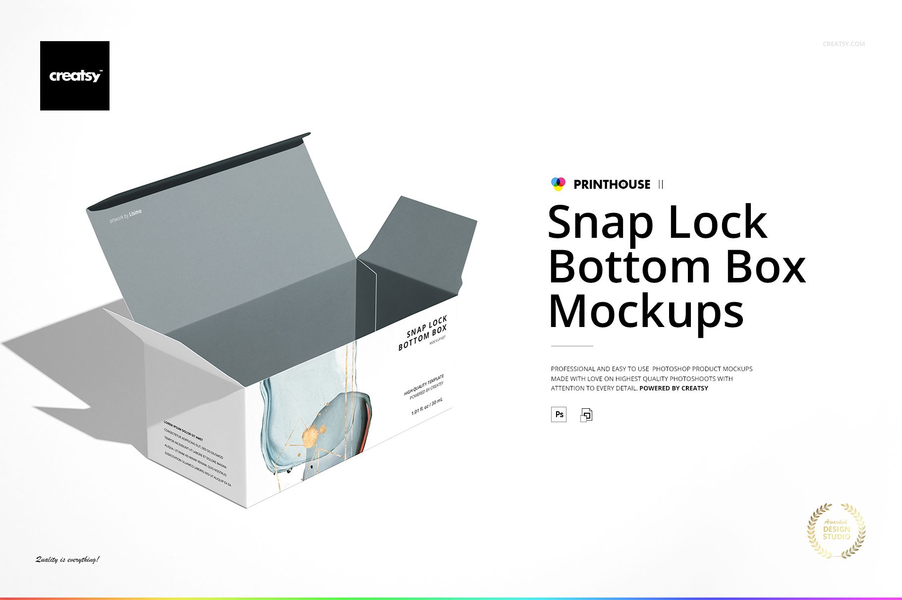 The Snap Lock Bottom Box Mockup Set template by Creatsy offers exceptional-quality images of a box in multiple angles and varying quantities for you to mock up your designs. The well-organized, customizable Adobe Photoshop layers of the mockup set enable you to showcase your design realistically, exactly how you like them. You can set custom colors and textures for the background and changing the box's design is easy. You can remove objects and shadows in the box mockup layers to save it with transparency. This mockup is guaranteed to make your design stand out from the crowd.