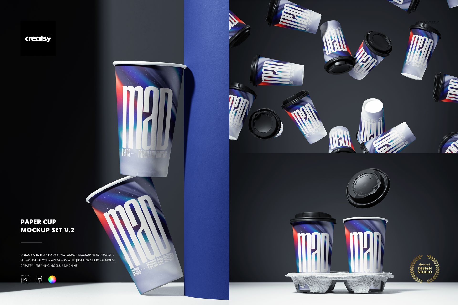 Embrace the glorious madness of creativity with Creatsy's Paper Cup Mockup Set v.2! This unique collection of 10 mesmerizing paper cup mockups invites you and your clients to explore a world of artistic anarchy. It's a blank canvas for your wildest ideas!