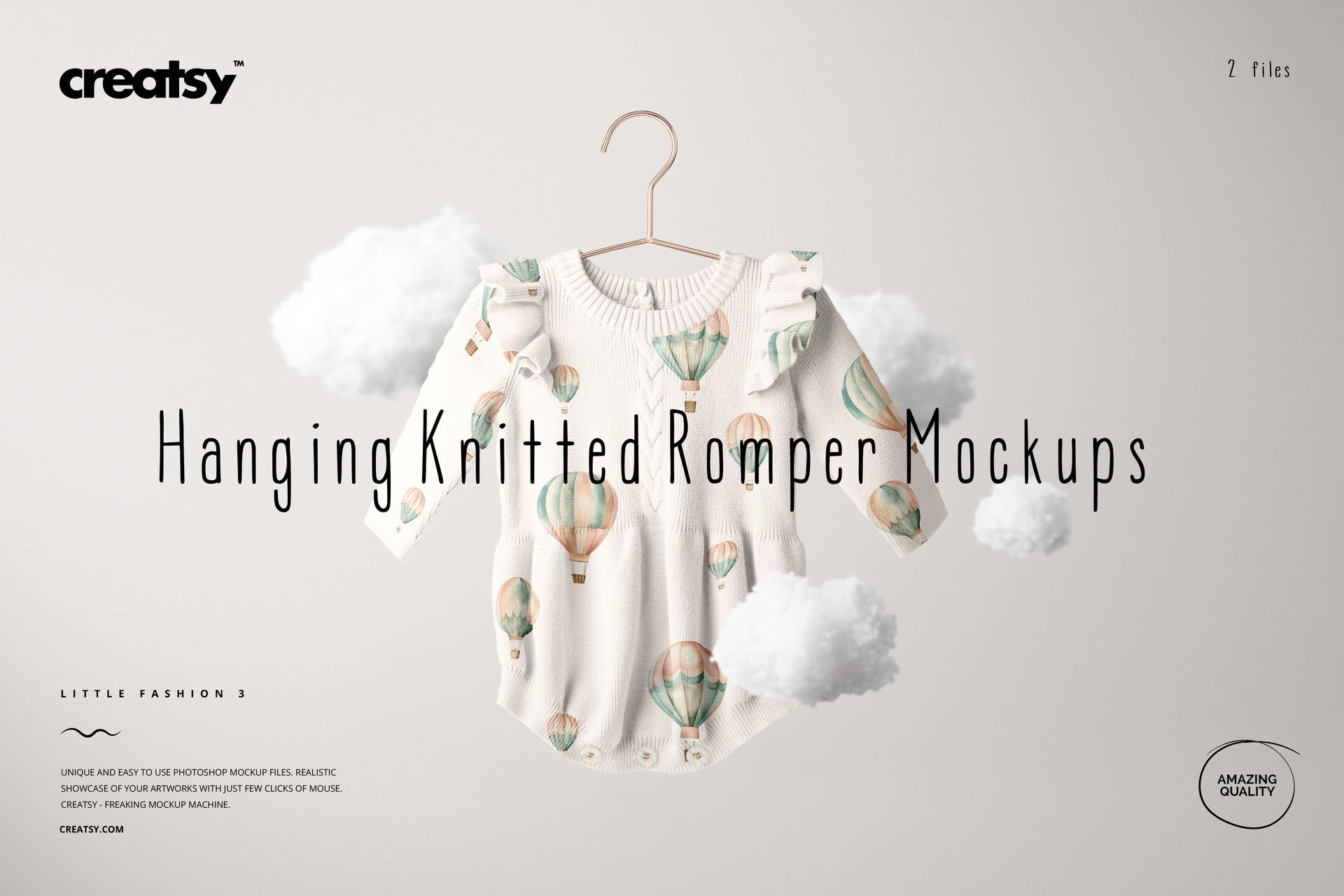 Take your next babywear design to new heights with the Hanging Knitted Romper Mockup Set. Created with care and imagination, this set turns every stitch into a story and every detail into a dream. Just one look and you’re floating among the clouds – gentle, playful, and full of possibility.