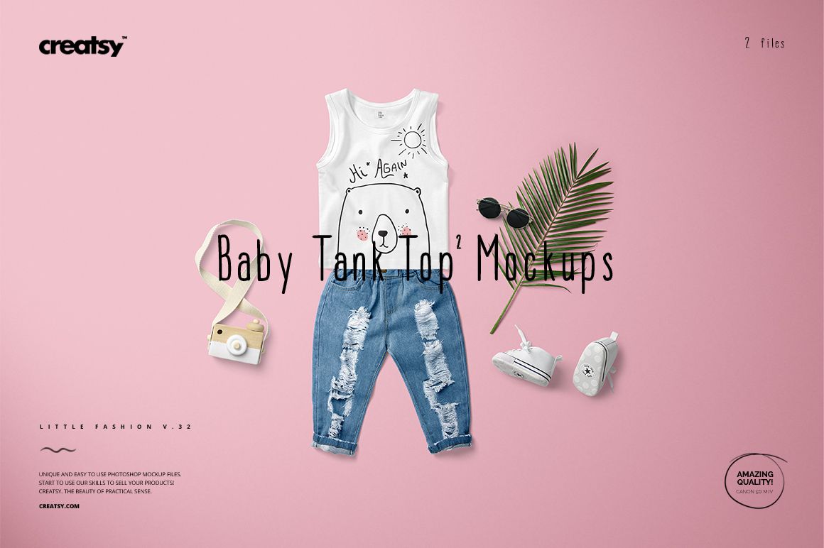 Baby Tank Top 2 Mockup Set (32/LFv.1) is a mockup set with layered, editable Adobe Photoshop files prepared from high-resolution images. Color layers and smart objects allow you to showcase your custom design with maximum editability. With the help of mockup files, presenting your designs professionally will give you an edge over your competitors.