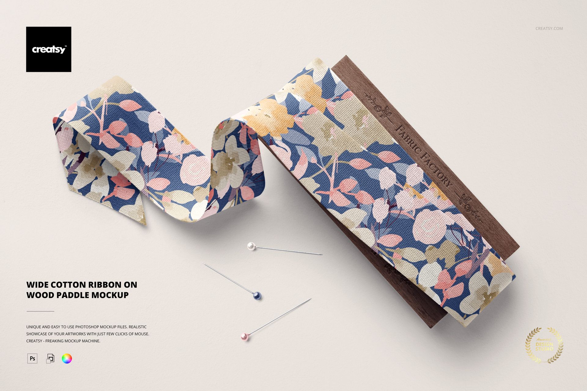 Wide Cotton Ribbon on Wood Paddle Mockup template by Creatsy offers fully customizable stylish ribbon mockups using only the best-quality images. This allows your designs to be displayed with realistic texture in this must-have ribbon mockup. These perfectly warped images will showcase your designs with finesse. Precisely prepared overlay layers of shadows and highlights will blend your creations into the mockup scene without losing color saturation. You can apply solid colors, gradients, and custom designs to this Wide Cotton Ribbon on Wood Paddle Mockup set to tailor it to your specifications. Complete with easy-to-follow instructions to make mocking up your designs a breeze, even if you’re new to the Adobe Photoshop software or using a mockup template.