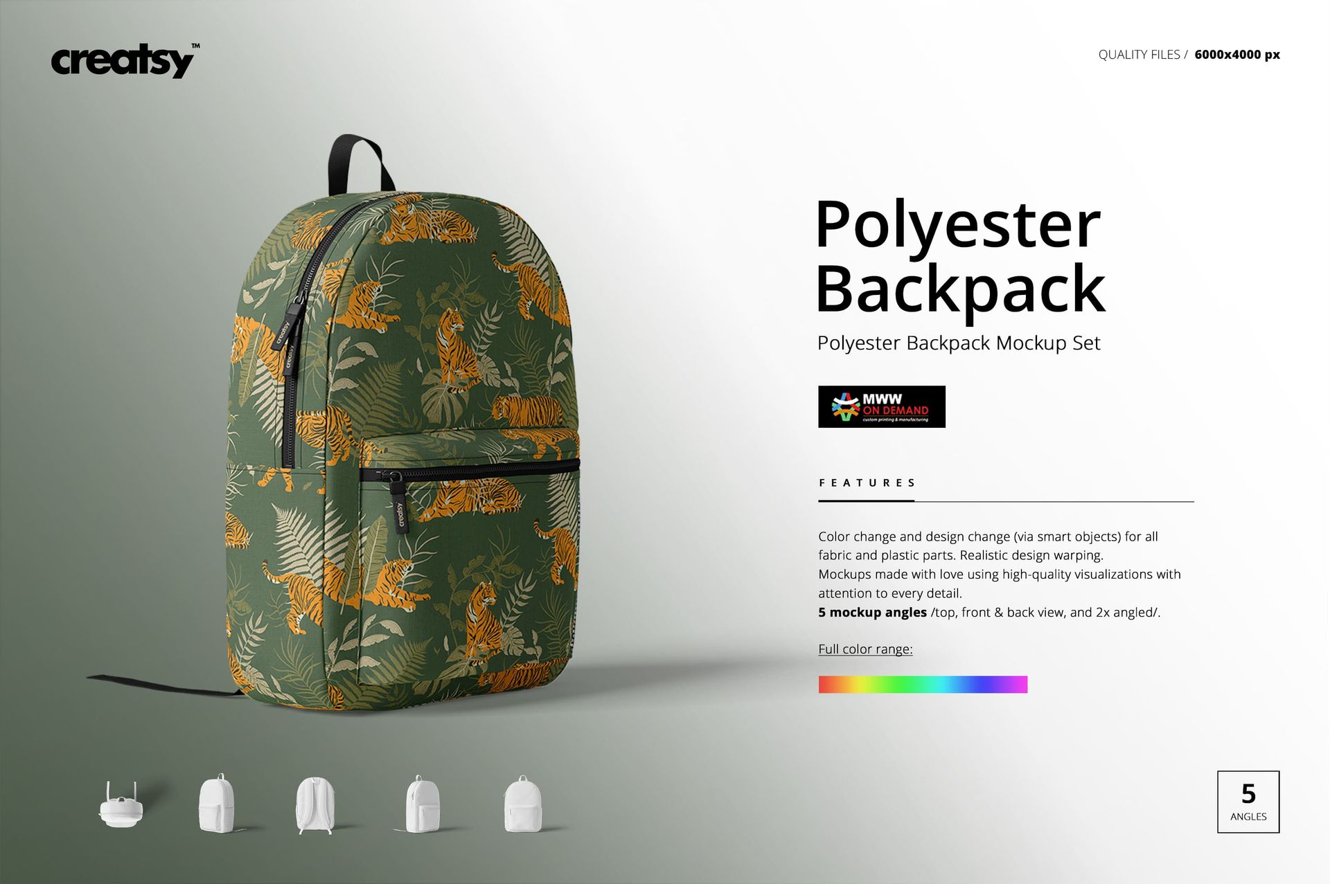 Polyester Backpack Mockup Set is a set of layered, editable files prepared to showcase your custom design. Editing smart objects and color layers in Adobe Photoshop allows you to customize your designs. With the help of mockup files, you’ll showcase your design as if it’s an already-made product to present it professionally. Using well-made mockup files helps you stand out from the crowd and gain a competitive advantage in the marketplace.