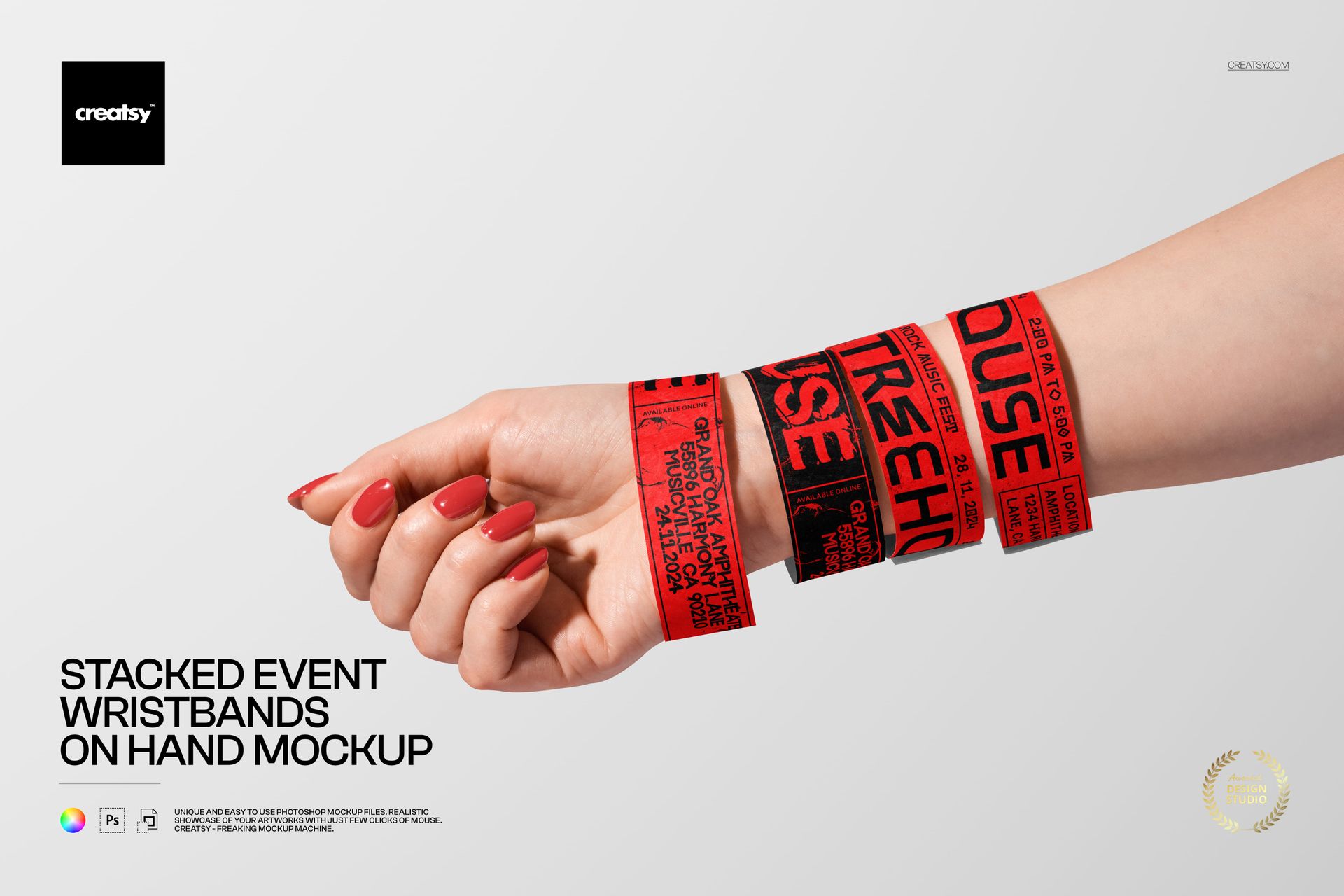 A clean, on-hand scene for event/festival wristband branding. Drop your artwork into the Smart Object, adjust lights/shadows, and export a polished visual ready for listings, decks, or socials. (Works in Photoshop CC2020+ and Photopea.)