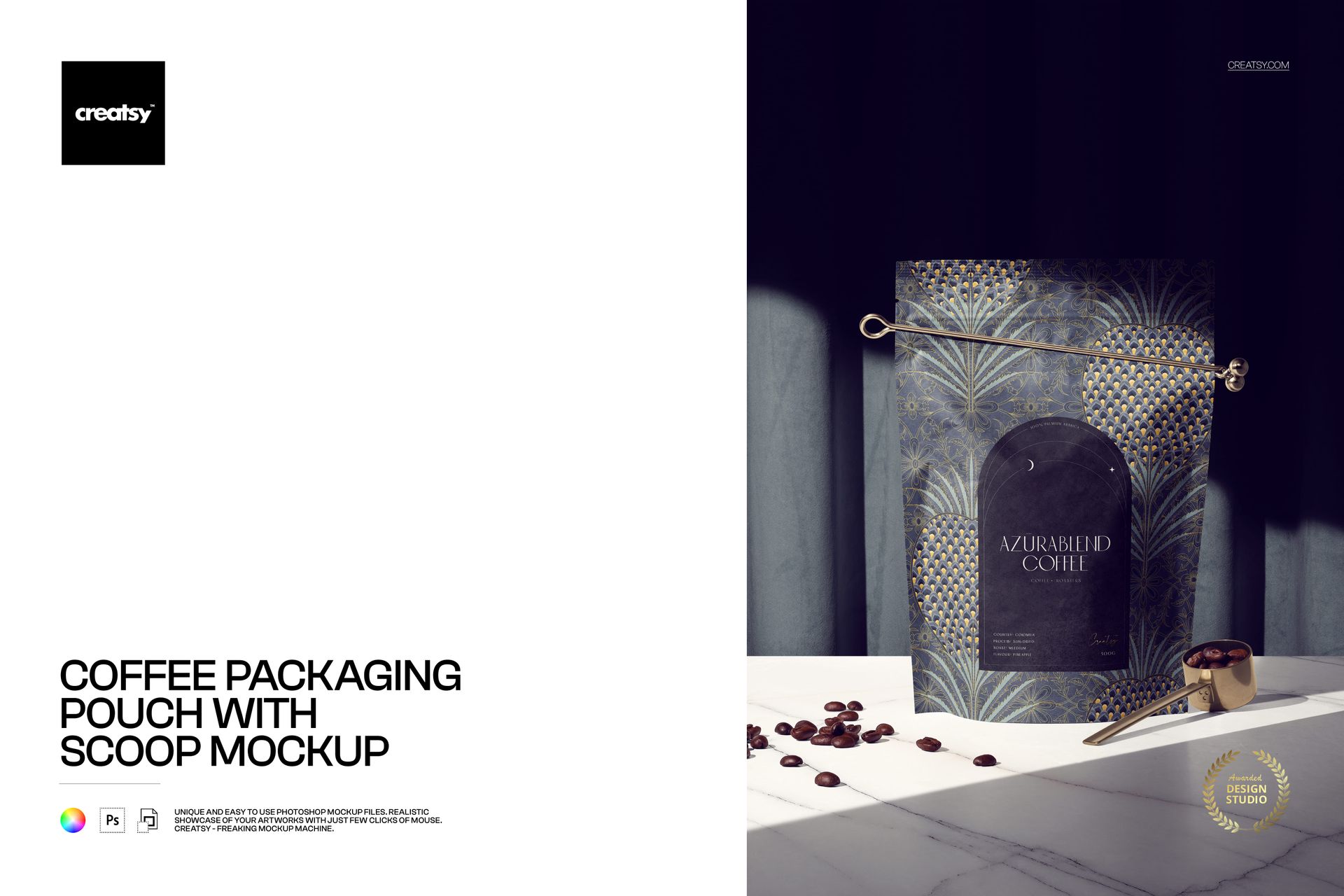 - Effects & details: realistic pouch folds, soft spotlight, long shadows, metal reflections, and coffee beans