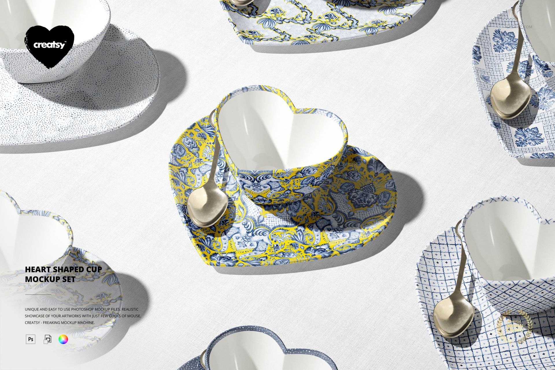 Heart-Shaped Cup Mockup Set is a set of high-definition photos made into well-organized mockup files for you to showcase your custom design. Smart objects and color layers allow you maximum control over how your design looks. You even have the option to save it without shadows and on transparency. With the help of mockup files, you’ll have a competitive edge to show licensing partners and customers how your designs will look as actual products.