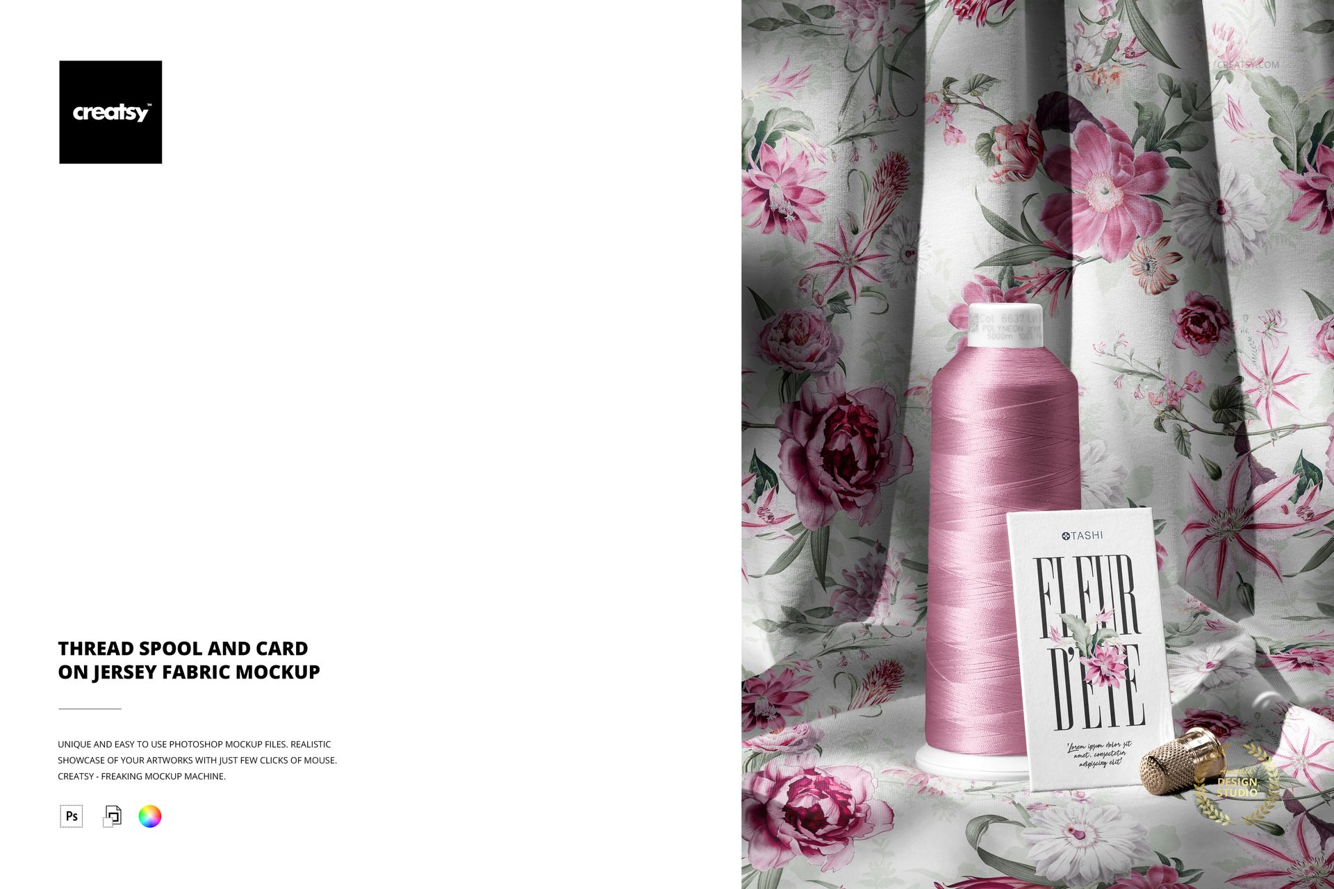 PSD mockup showing a thread spool and card on draped jersey fabric with a detailed pink flower pattern.